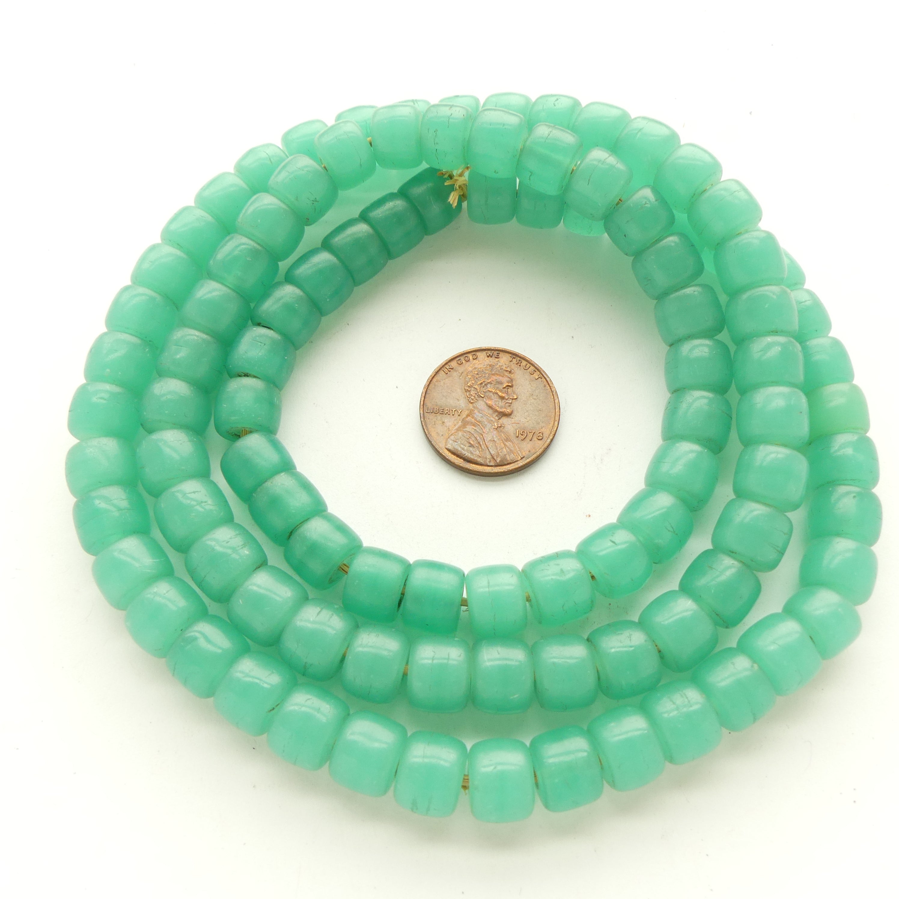 - Green "greasy" glass, chrysoprase color, short barrels 7x9mm on 28-inch strand