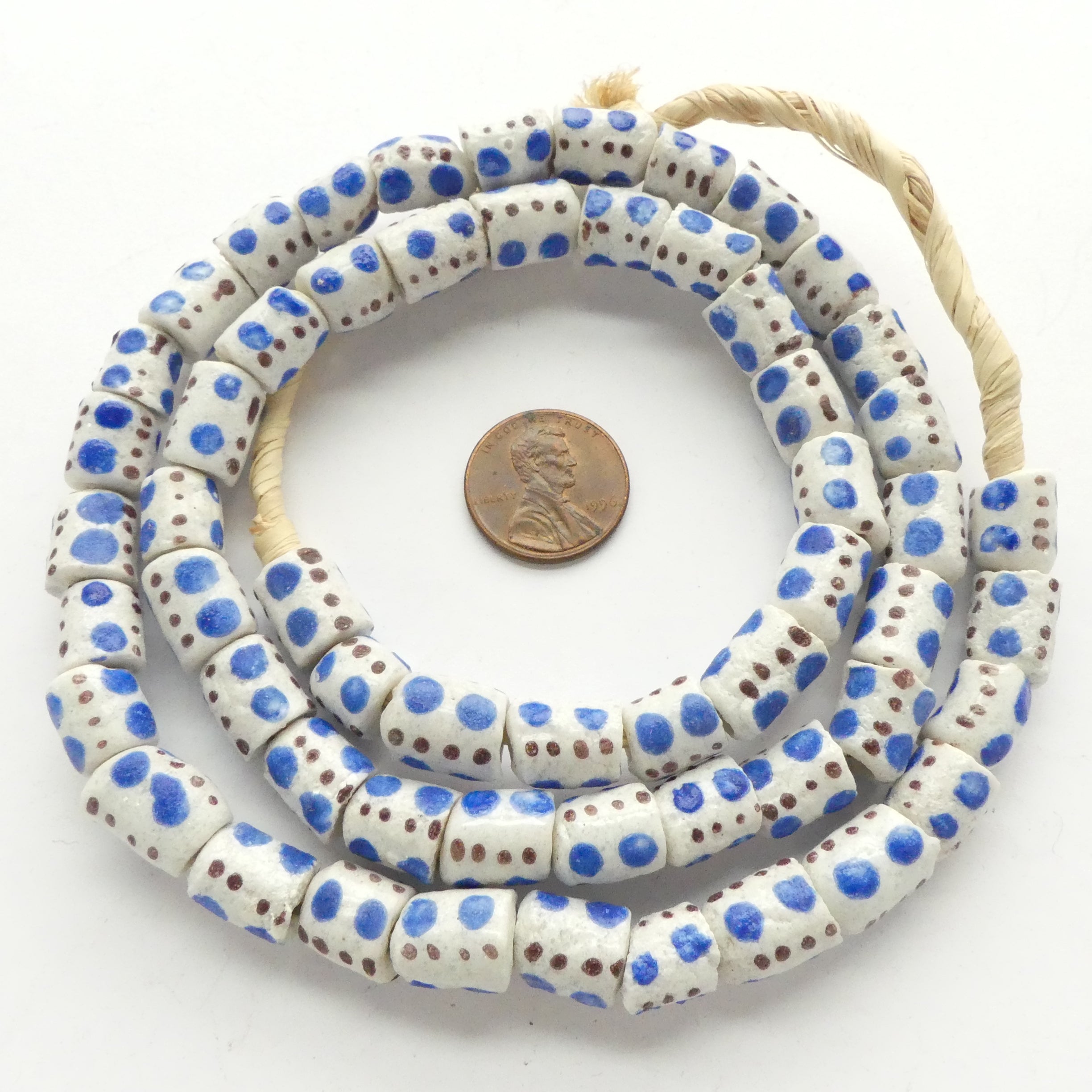 Krobo Powdered Glass Short Tubes with Design, White/Blue/Brown on 25-inch Strands