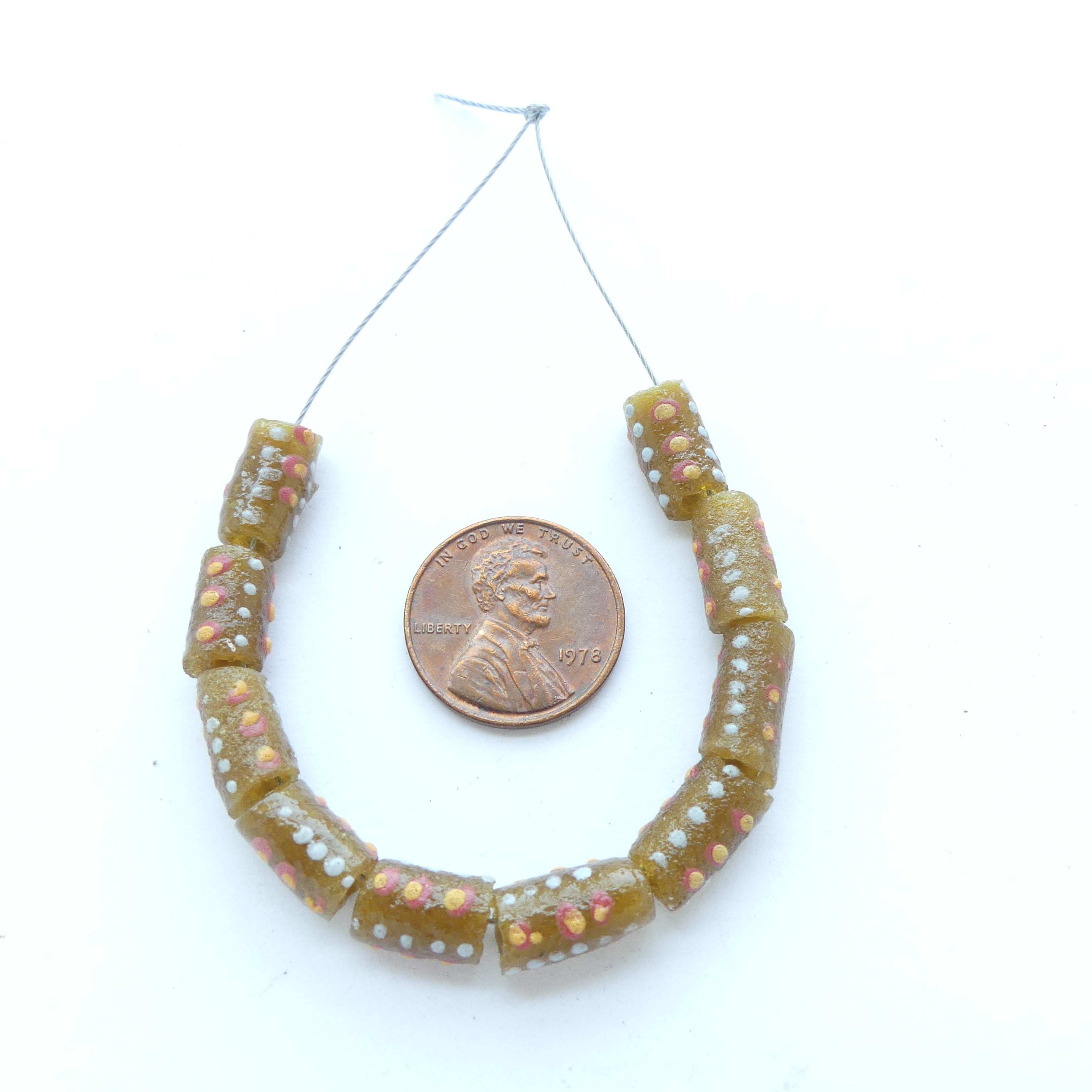 - Krobo Mini Powderglass beads, 12x6mm Khaki with red, amber & whiute dots