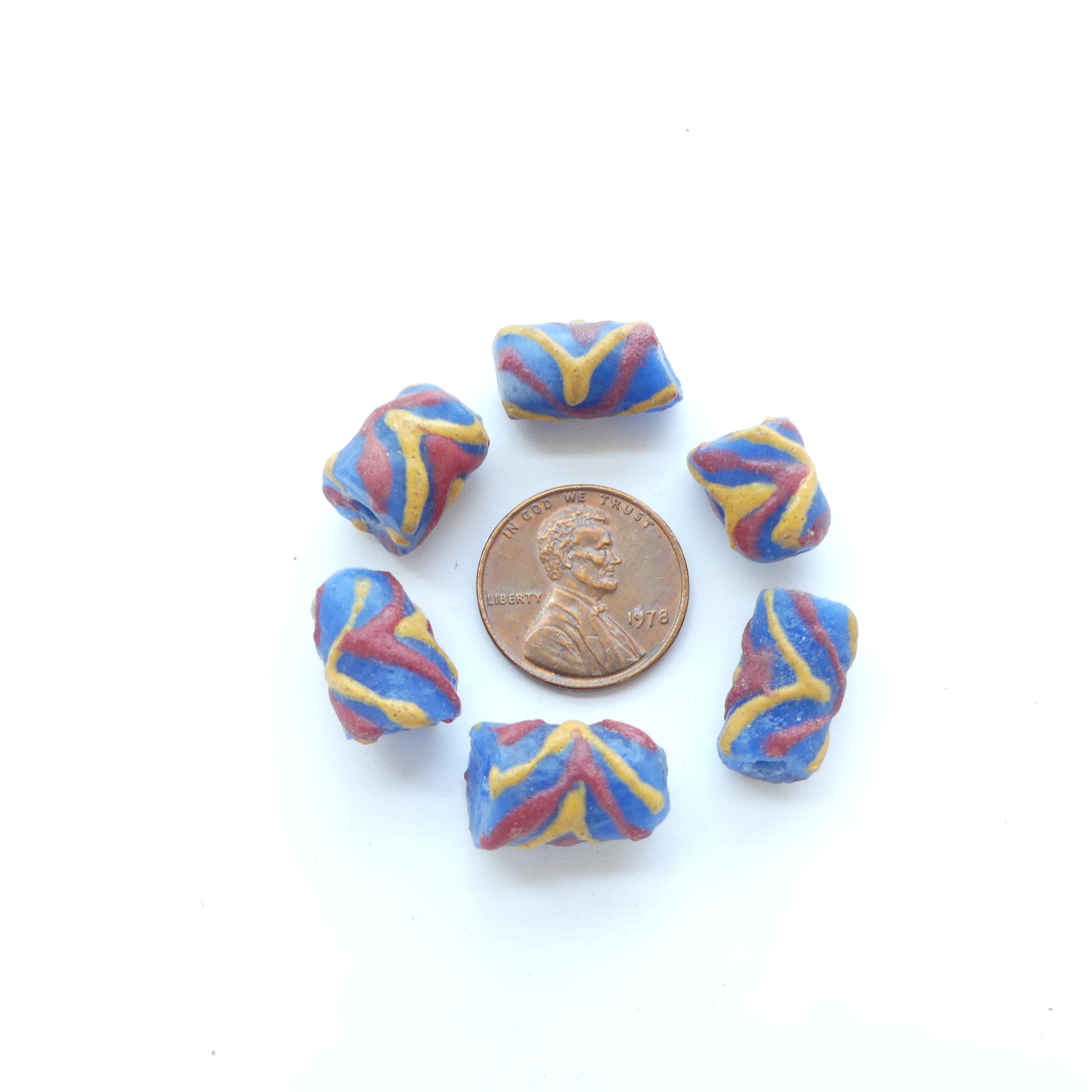 - Krobo blue powderglass short cylinders about 14x10mm amber and red designs