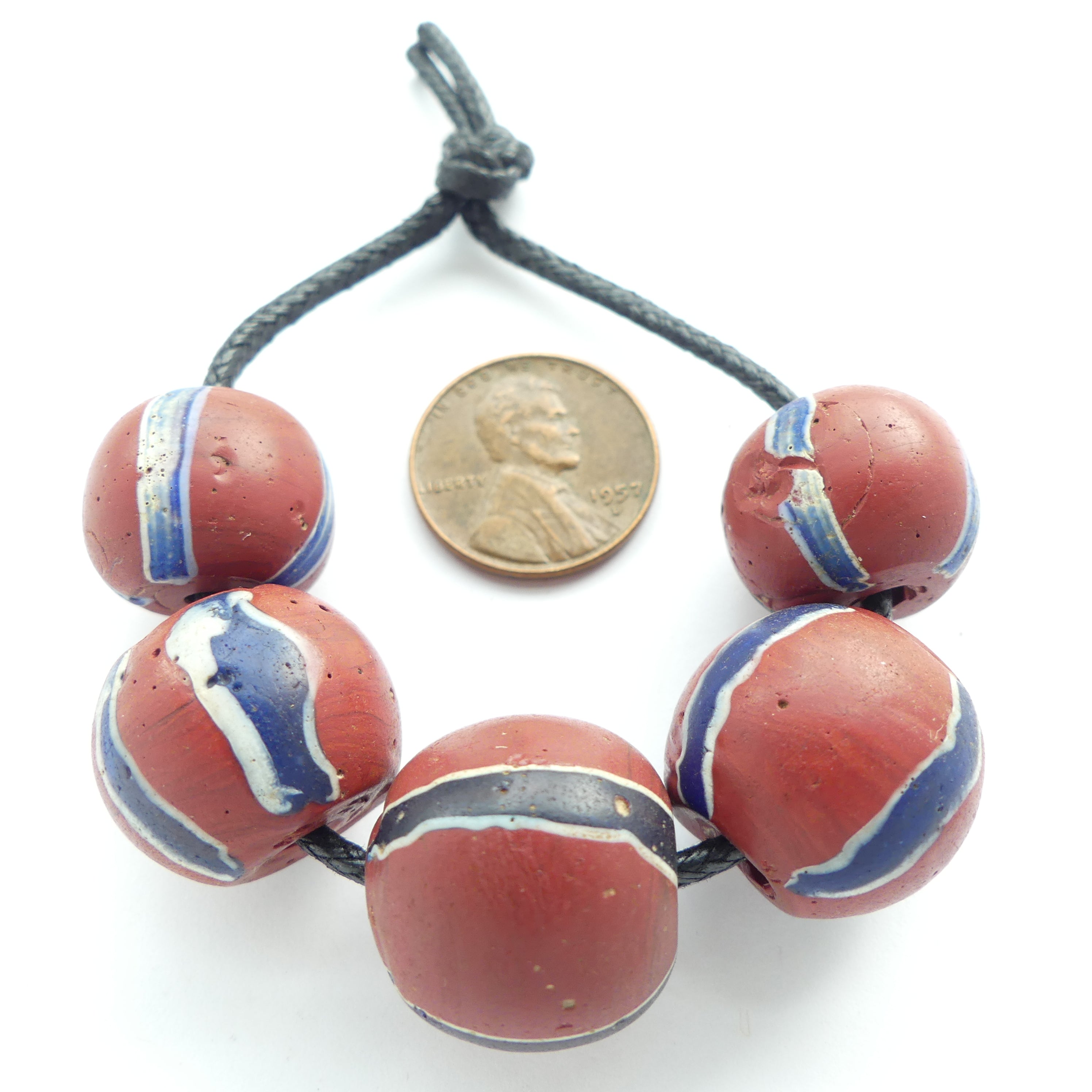 - Antique Venetian lampwork trade beads, bold brown round beads 14 to 18mm diameter. They are decorated with bold blue and white stripes