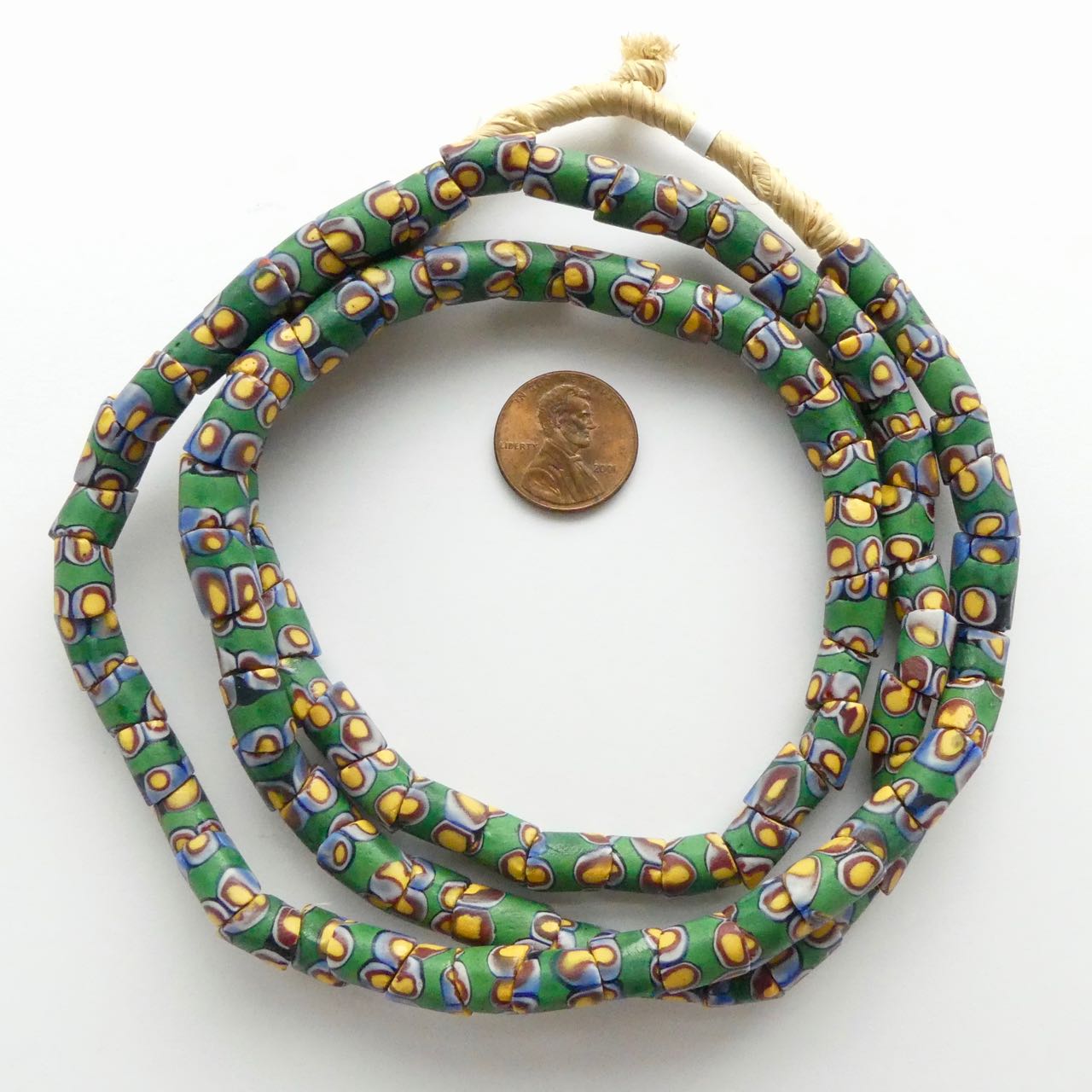 • Antique Venetian Millefiori trade beads, matched strand of small green beads 10x7mm with angled ends so that they work best strung in a curved shape