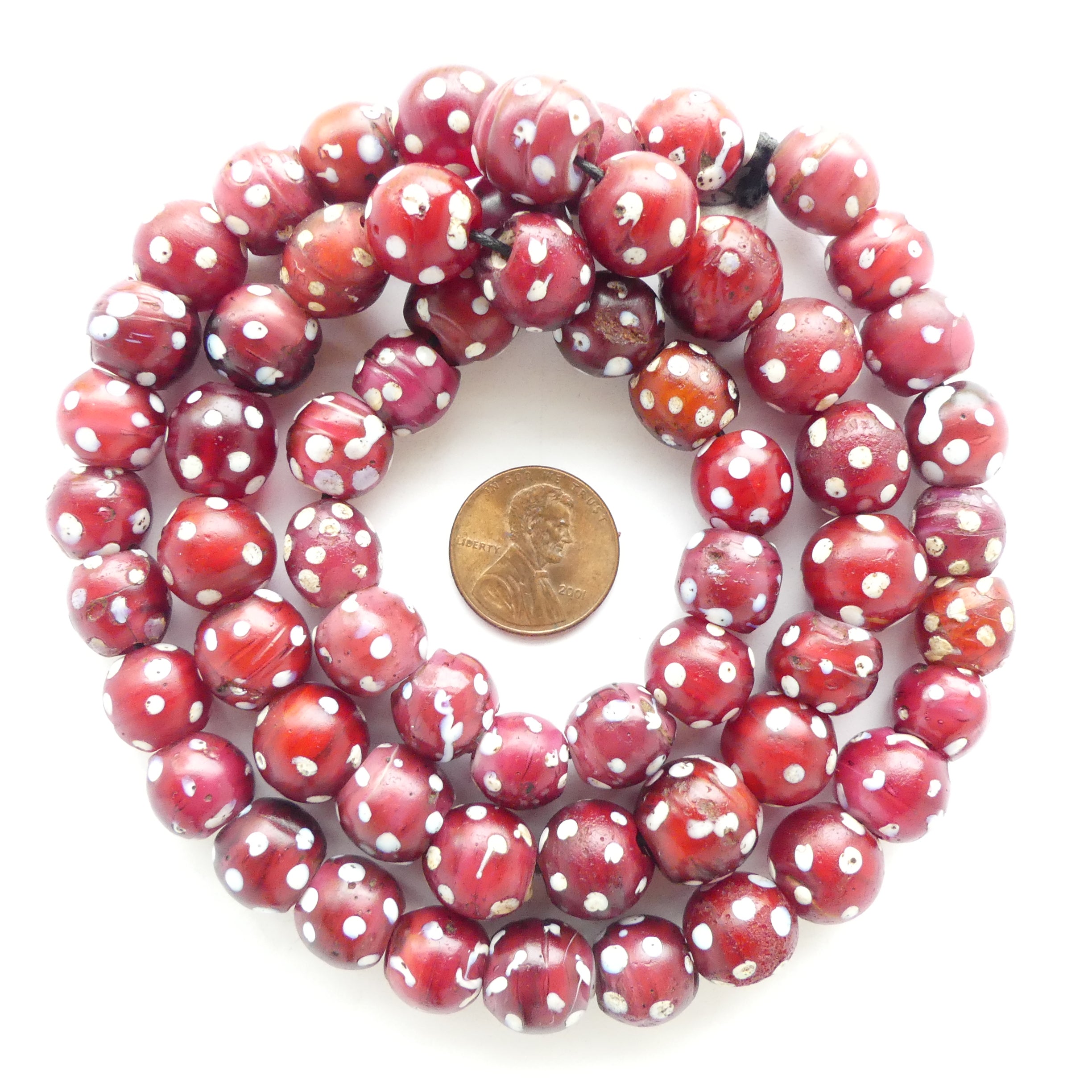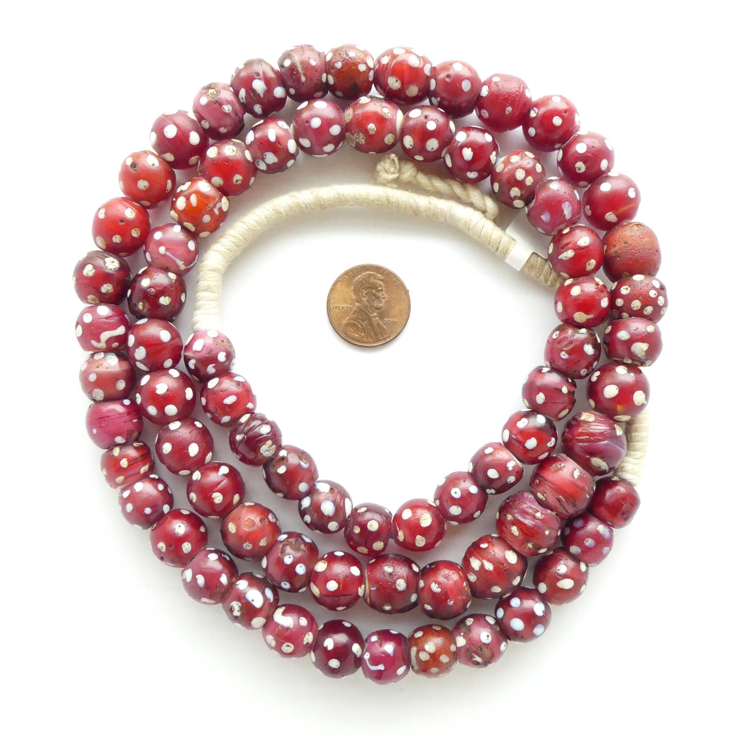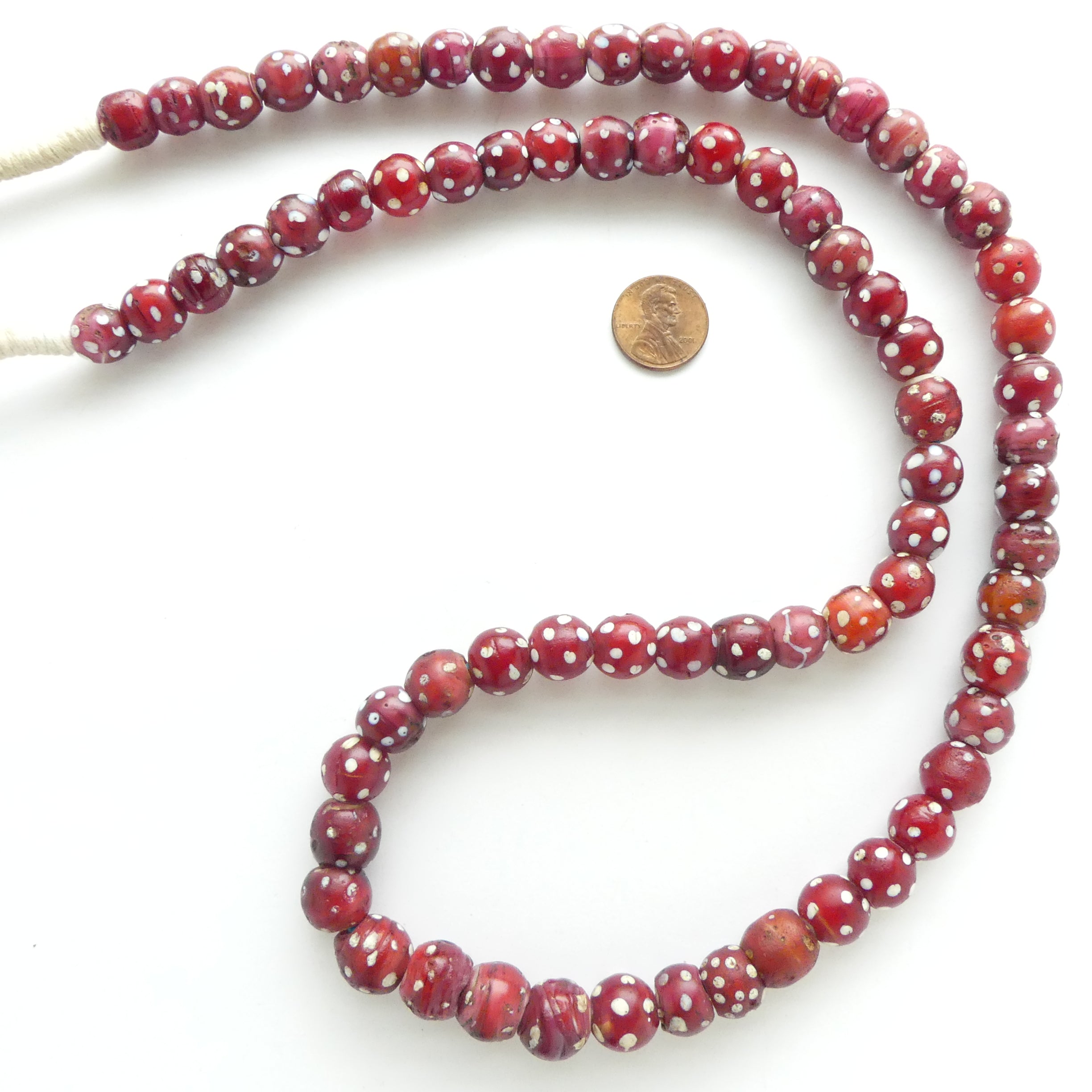 Named for their white core covered by a thin layer of translucent red glass, these beads were traded from Europe to every inhabited continent. Also known variously as Cornaline d'Aleppo for their resemblance to carnelian beads coming east from India through Syria and Turkey, or Hudson Bay Beads because early settlers and Mountain Men in that area traded them to Native Americans for pelts.