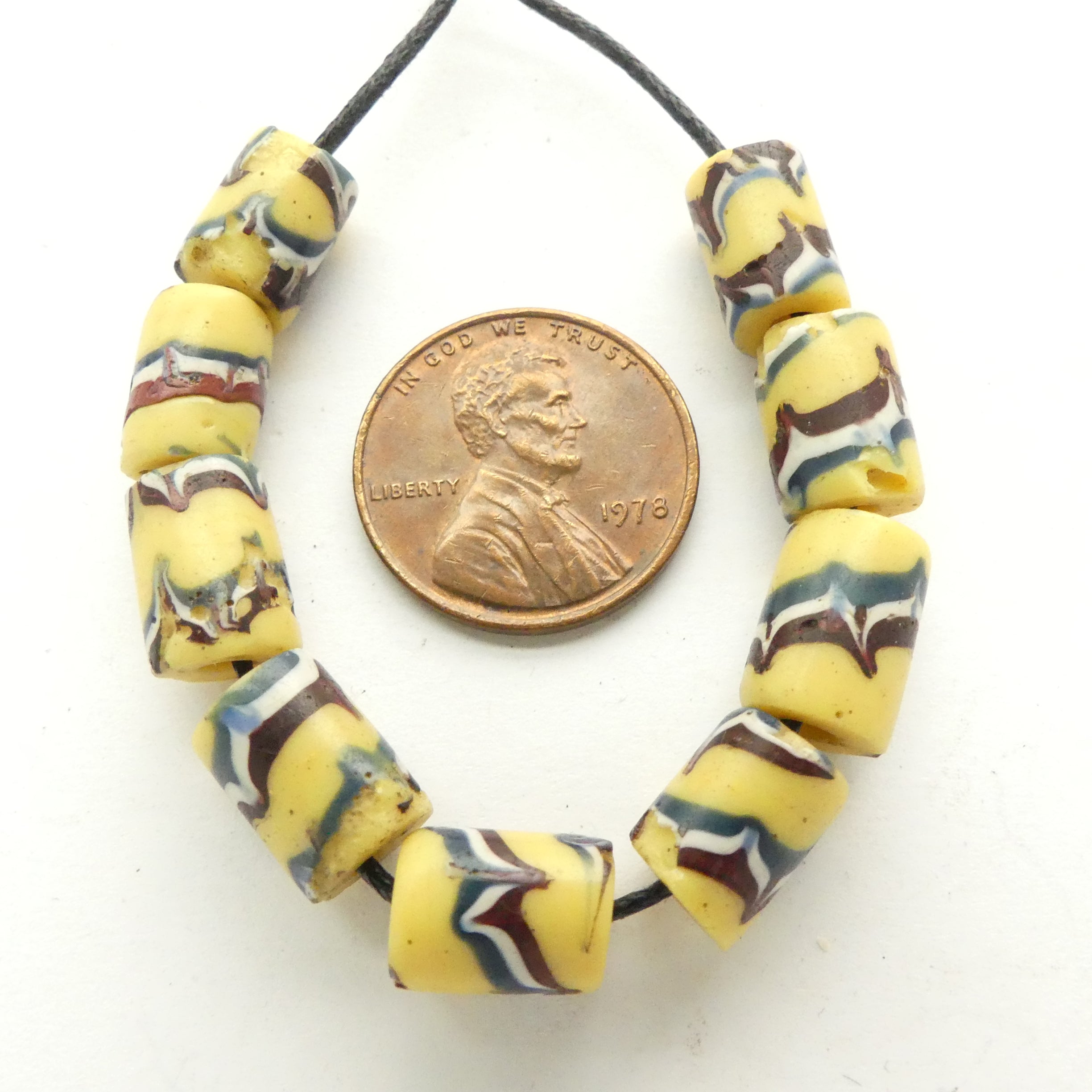 - Matched set of 9 yellow antique Venetian lampwork beads decorated spirals of blue, white and burgundy stripes that have been "feathered" by pulling a metal pick through the still-molten glass similar to how a barista feathers a latte