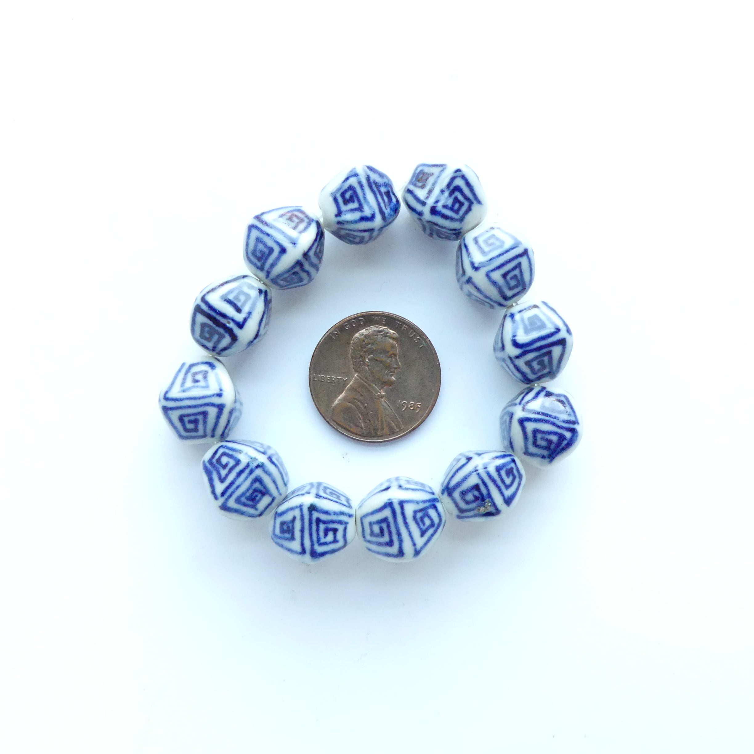 Blue & White Porcelain, Bi-Pyramid Shape, Geometric Design, Set of 12