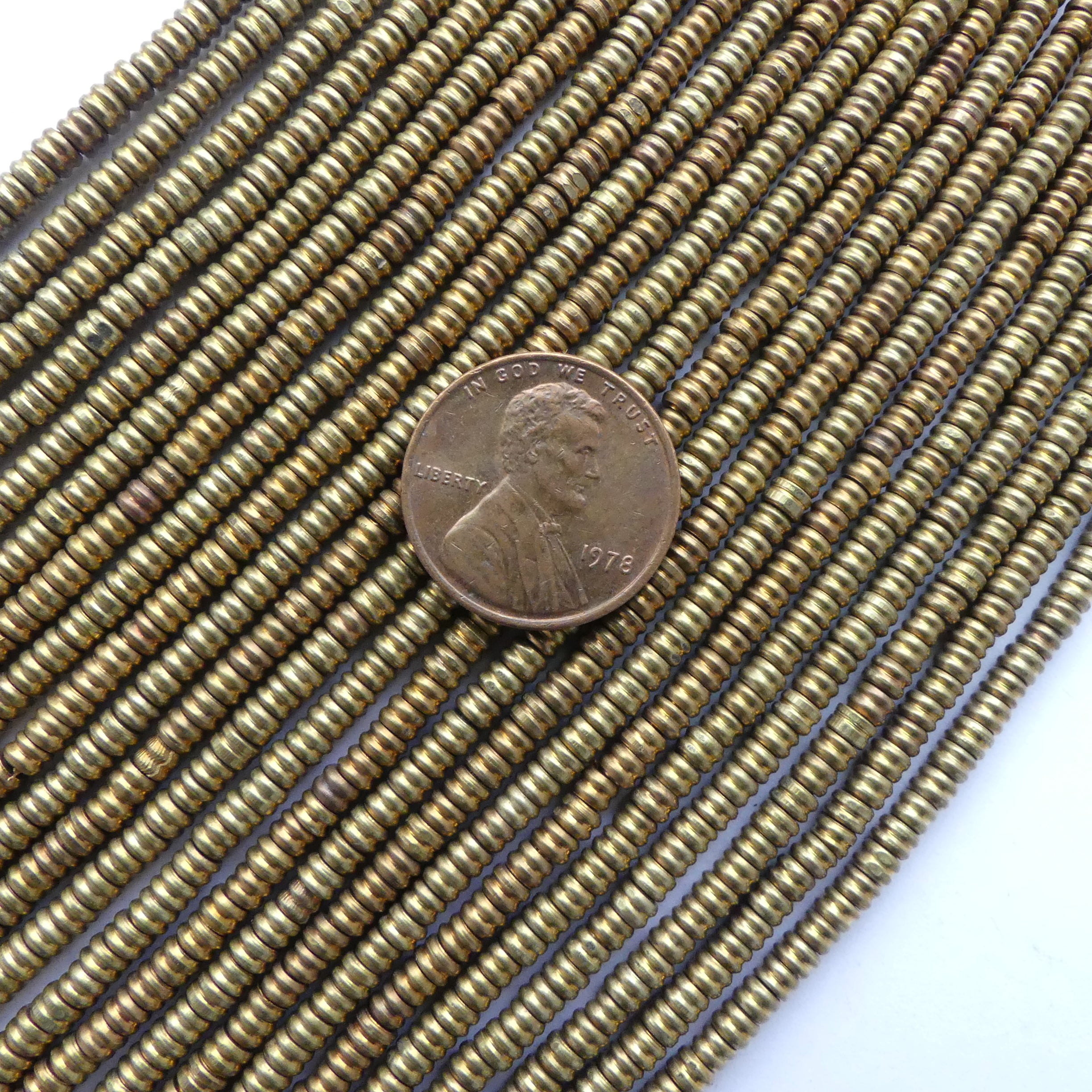 Brass, Short Ridged Mini Tubes, 2x3mm on Long 30-inch Strands