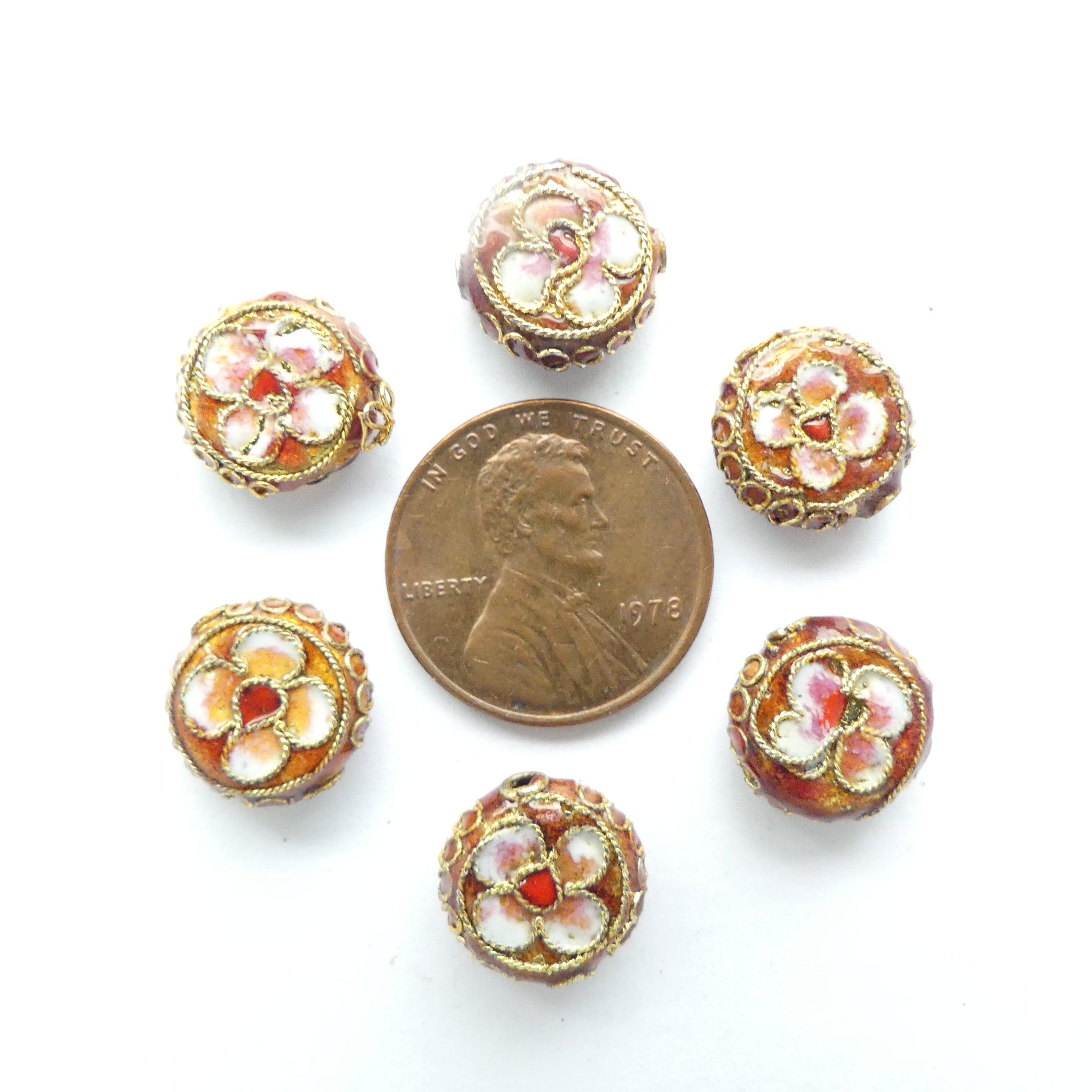 - Set of 6 coin shape cloisonne beads with floral design, 13mm