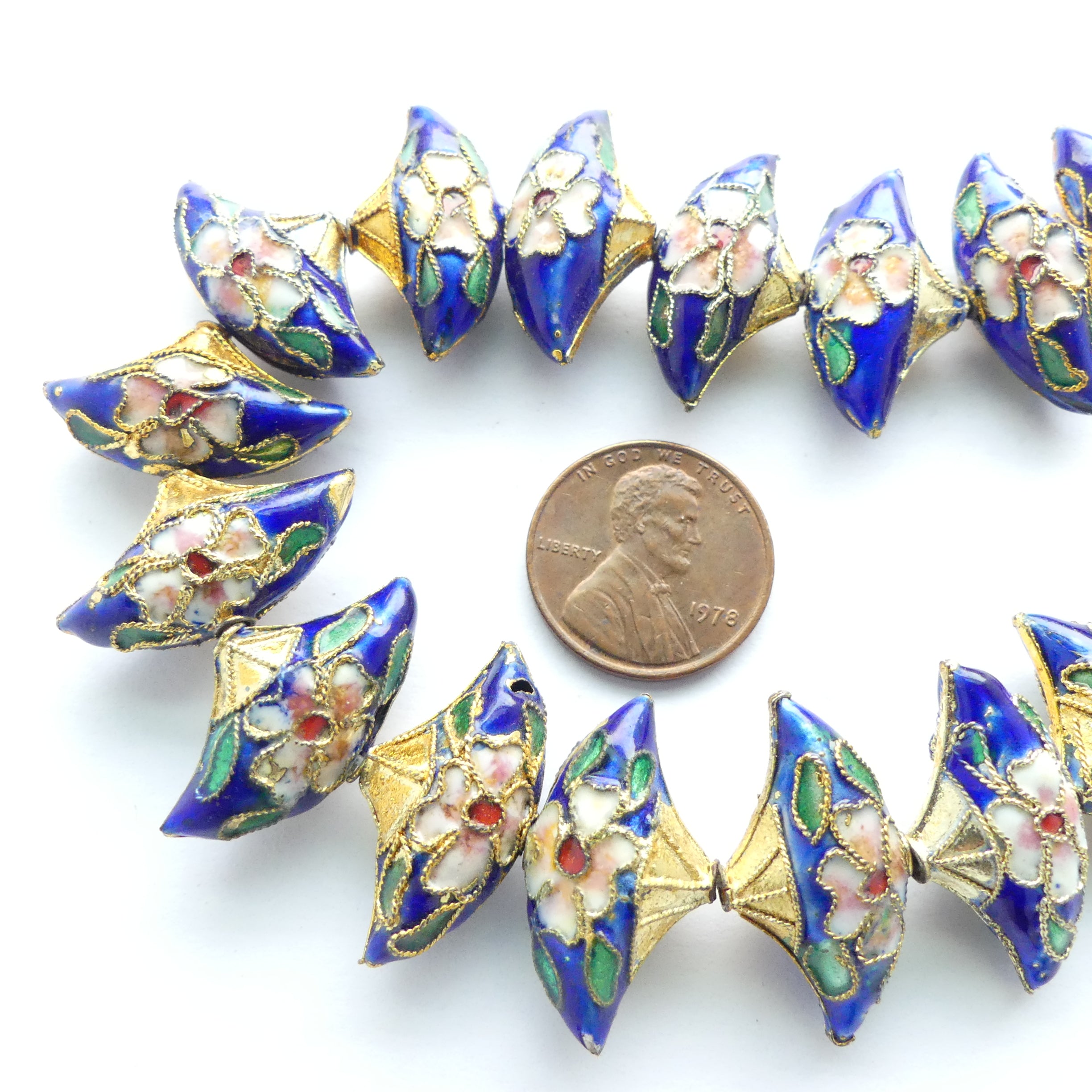 Enamel, Strand of Royal Blue Fan Shape Beads with Floral Design
