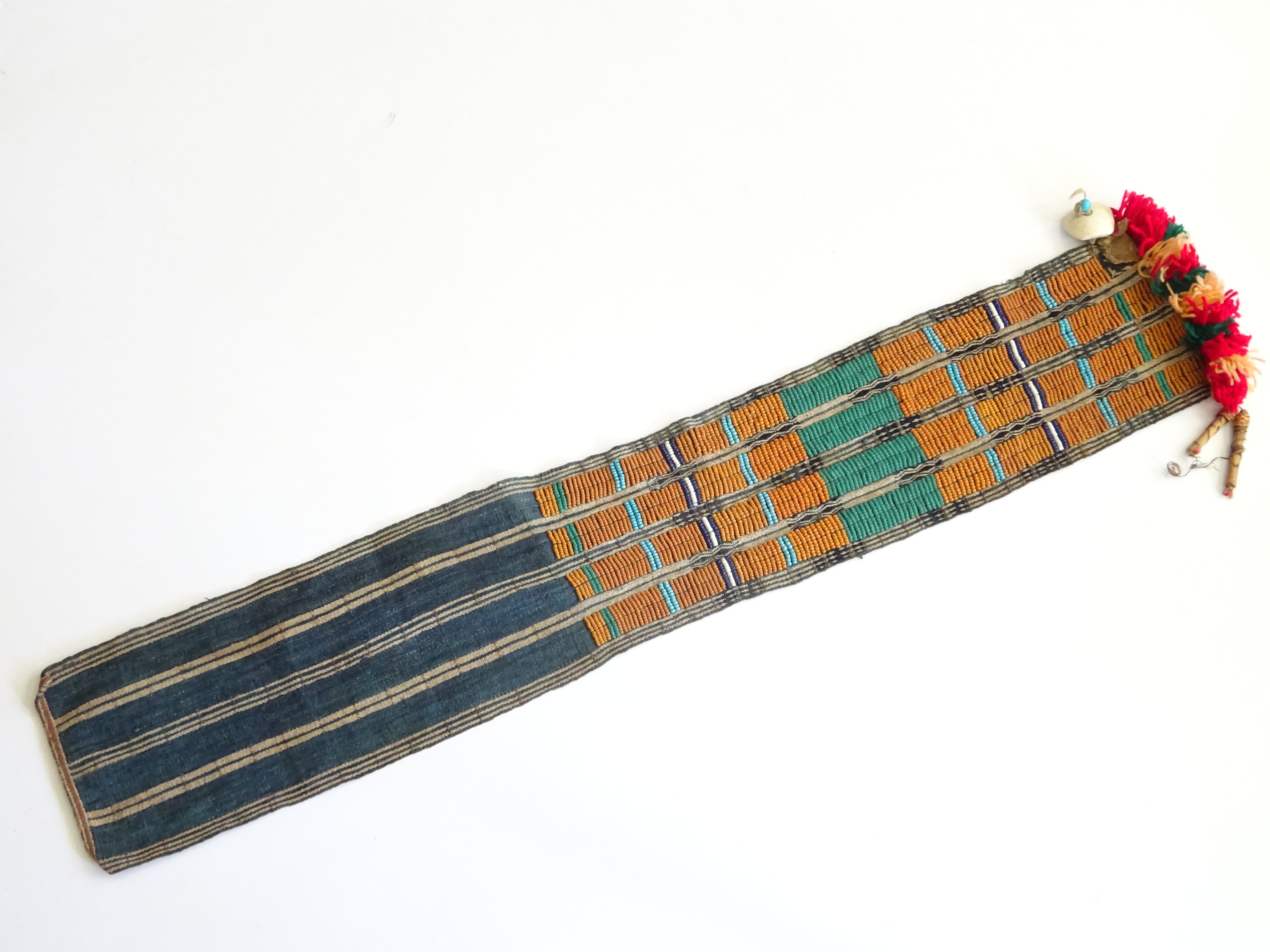 - Looks like indigo and natural cotton handwoven base with some delicate patterning between the beaded sections.