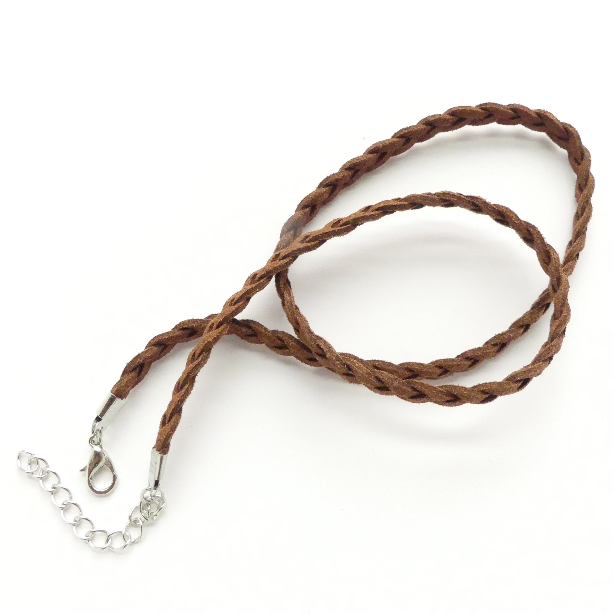 - Brown faux suede braided cord, 18" long with attached silver tone clasp and 2 inches of cable chain for an adjustable extension
