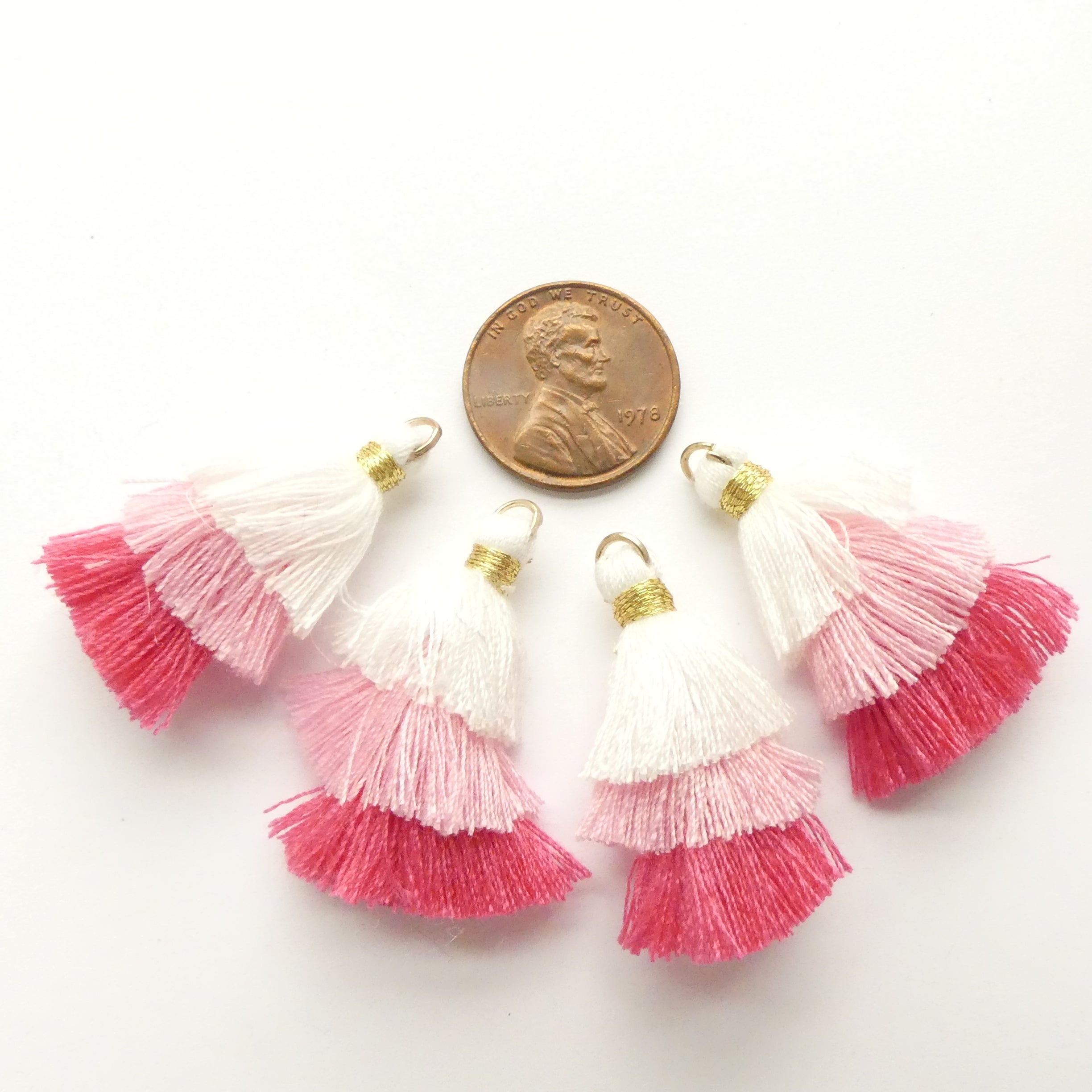 - Set of 4 three tier tassels in shades of pink with white, 1.5" long