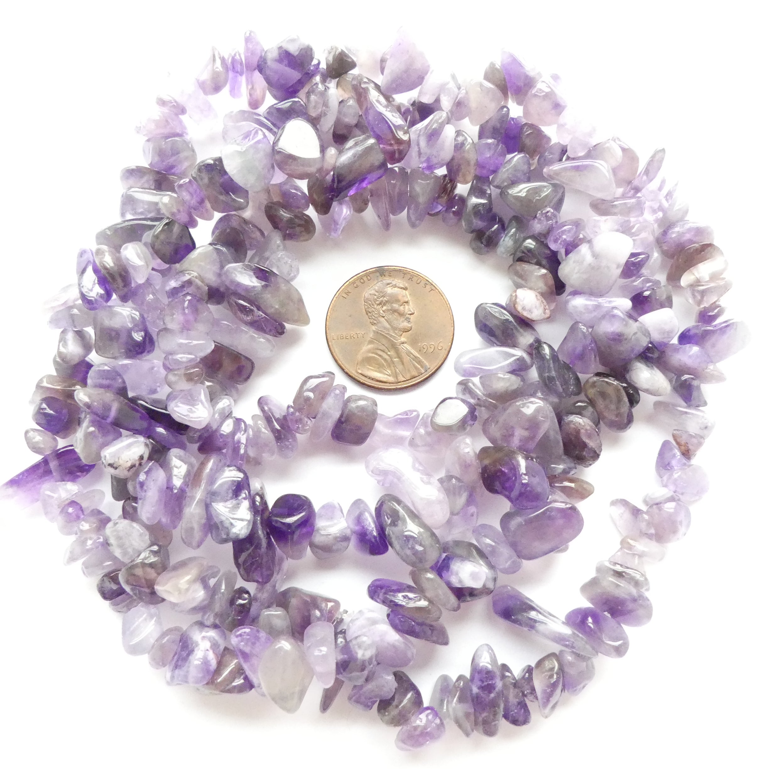 - A mix of medium amethyst and light cape amethyst chips on 36-inch "endless" strands