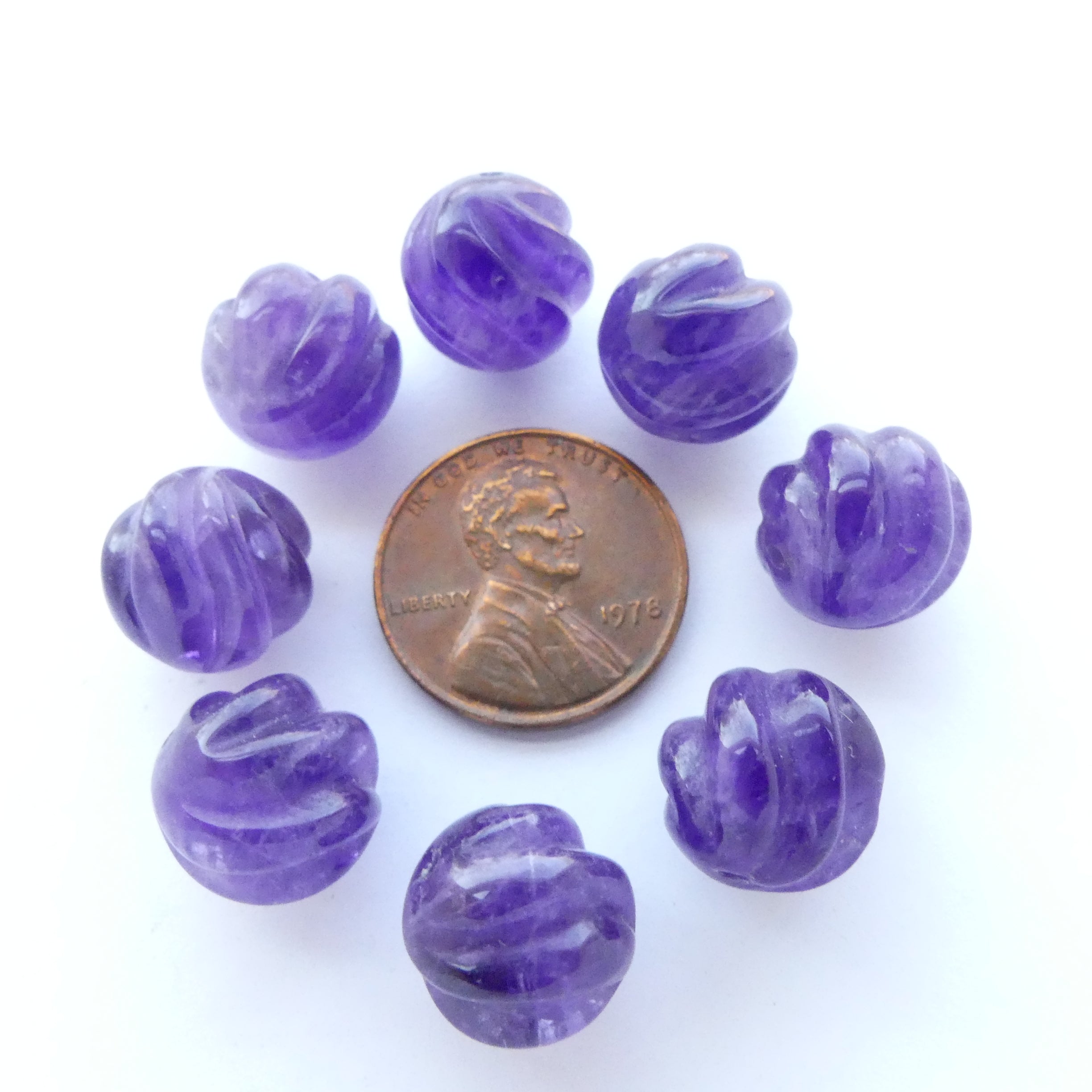 - Vintage Amethyst 12mm round beads hand-carved with spiral design