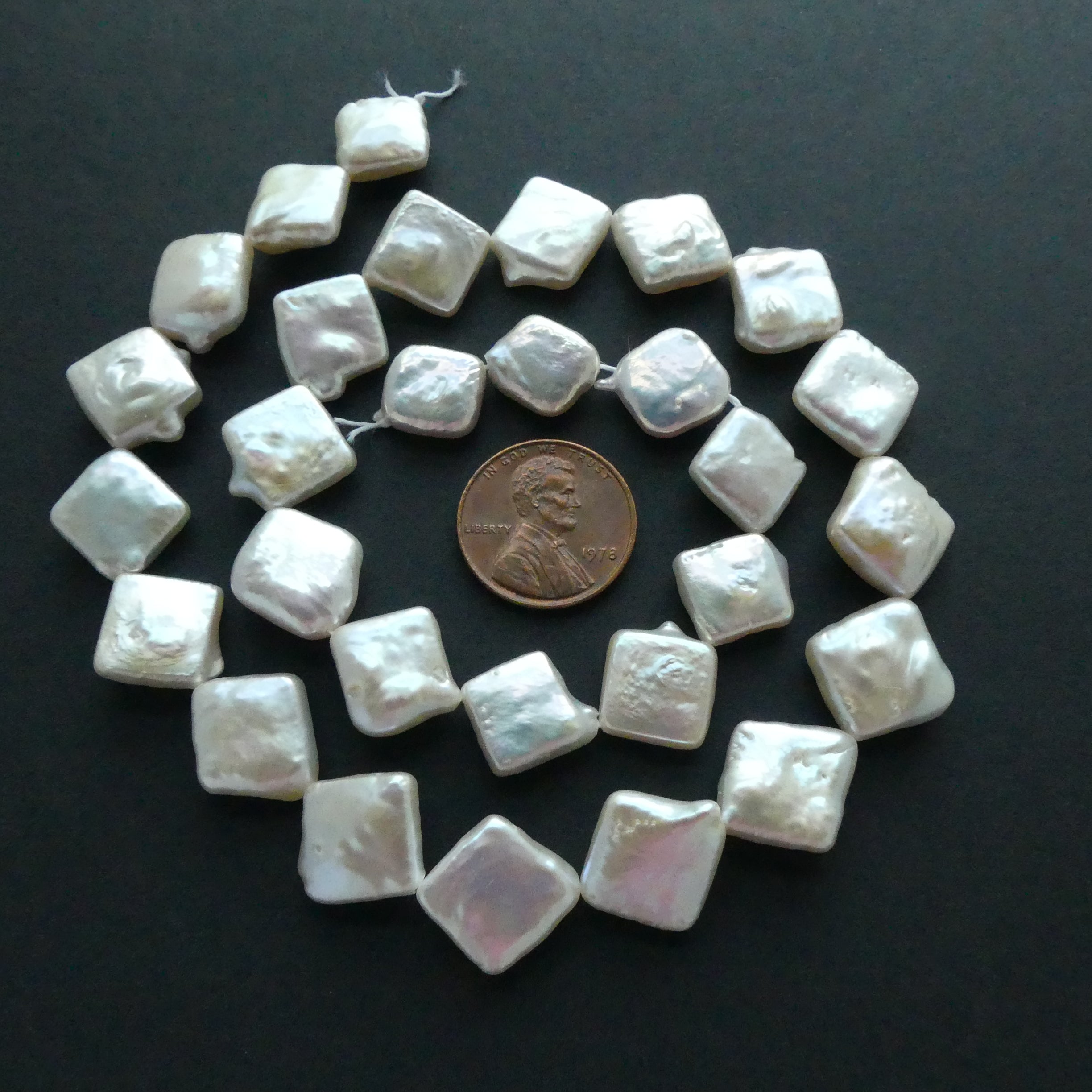 Pearls, White, Diamond Shape Drilled Corner to Corner, 12x12mm on 16-inch Strands