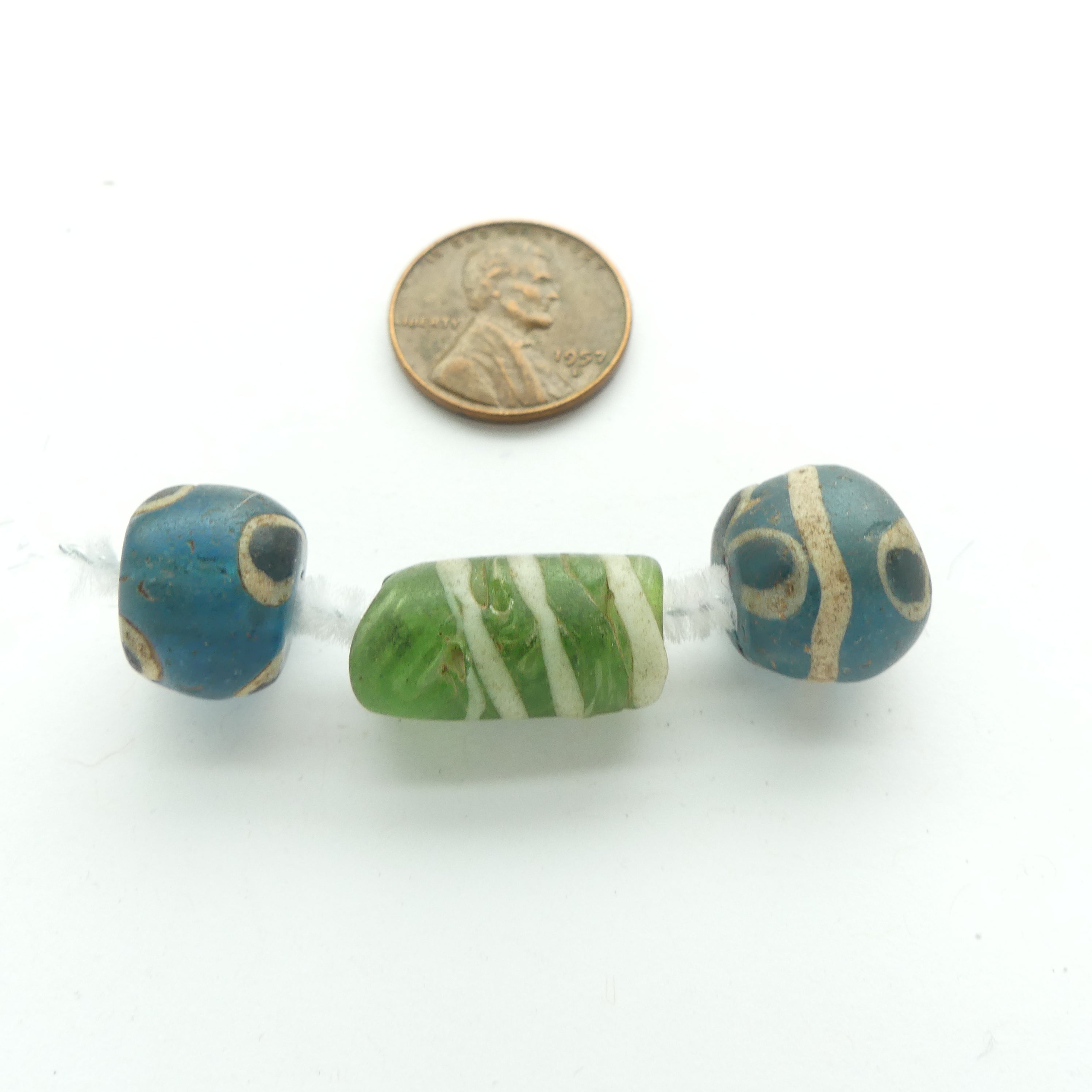 - Three Roman or Islamic, glass beads of the type that used to be found on strands of trade beads in the 1960s. Blue base with eye designs & green wound with white
