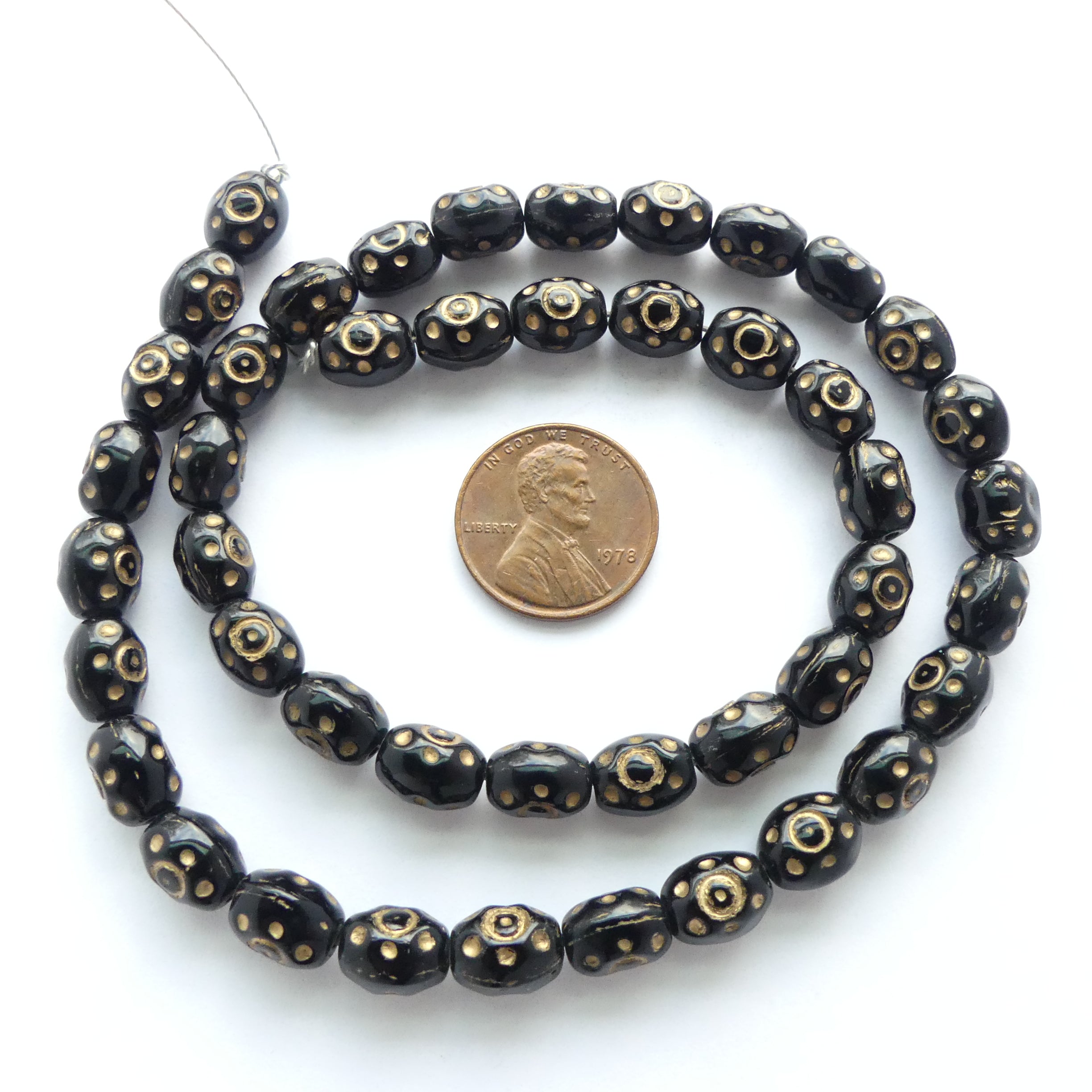 Czech Molded Glass Ovals, 9x7mm, Black with Gold Designs, 16-inch Strand