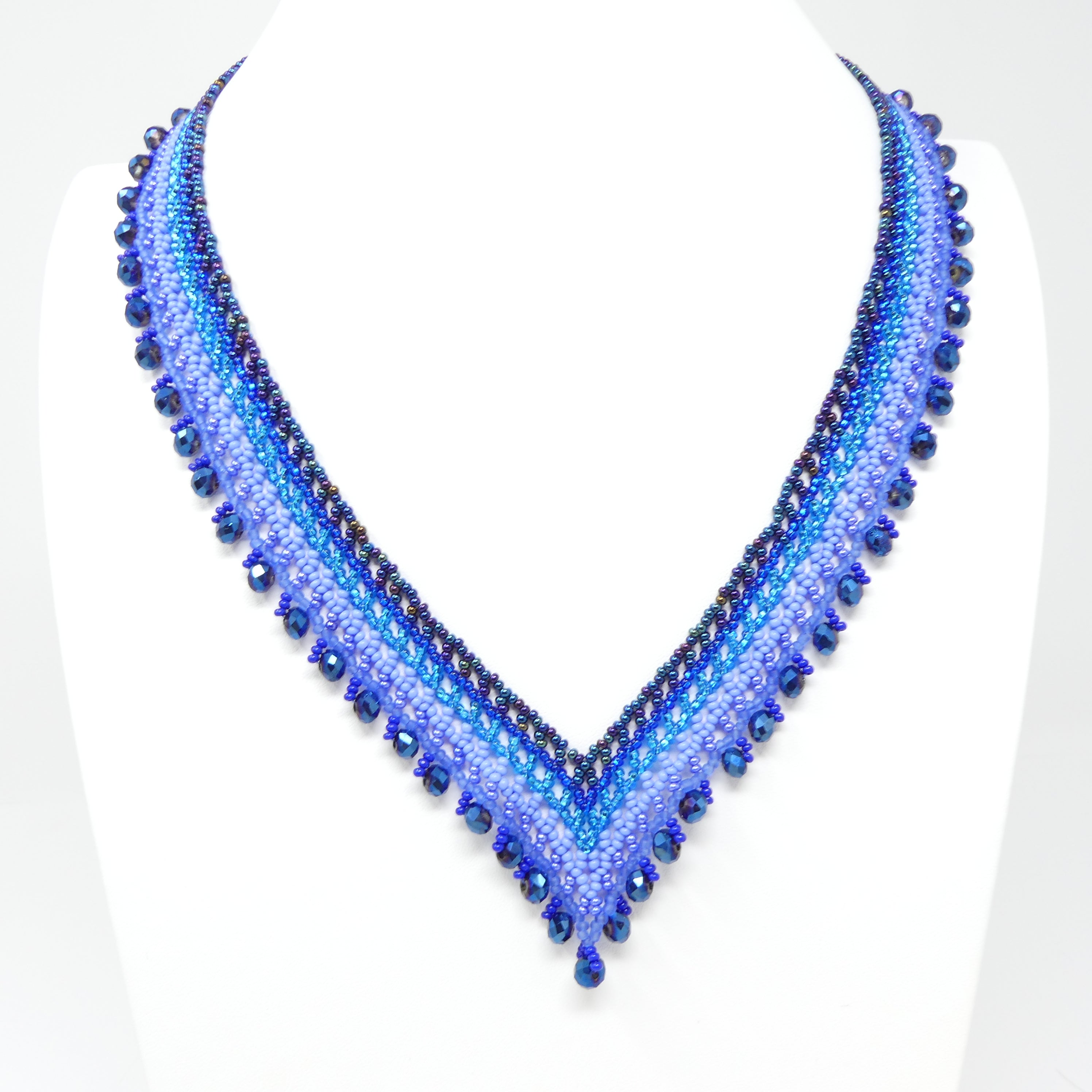- Webbing of nearly the whole spectrum of blue seed beads fringed with blue iris crystals