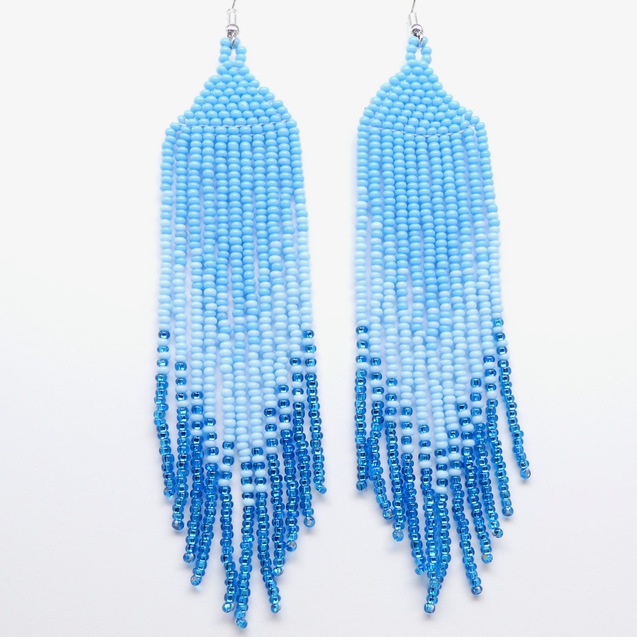 - Extra long fringe earrings, light opaque blues flowing into bright silver-lined aqua Czech seed beads