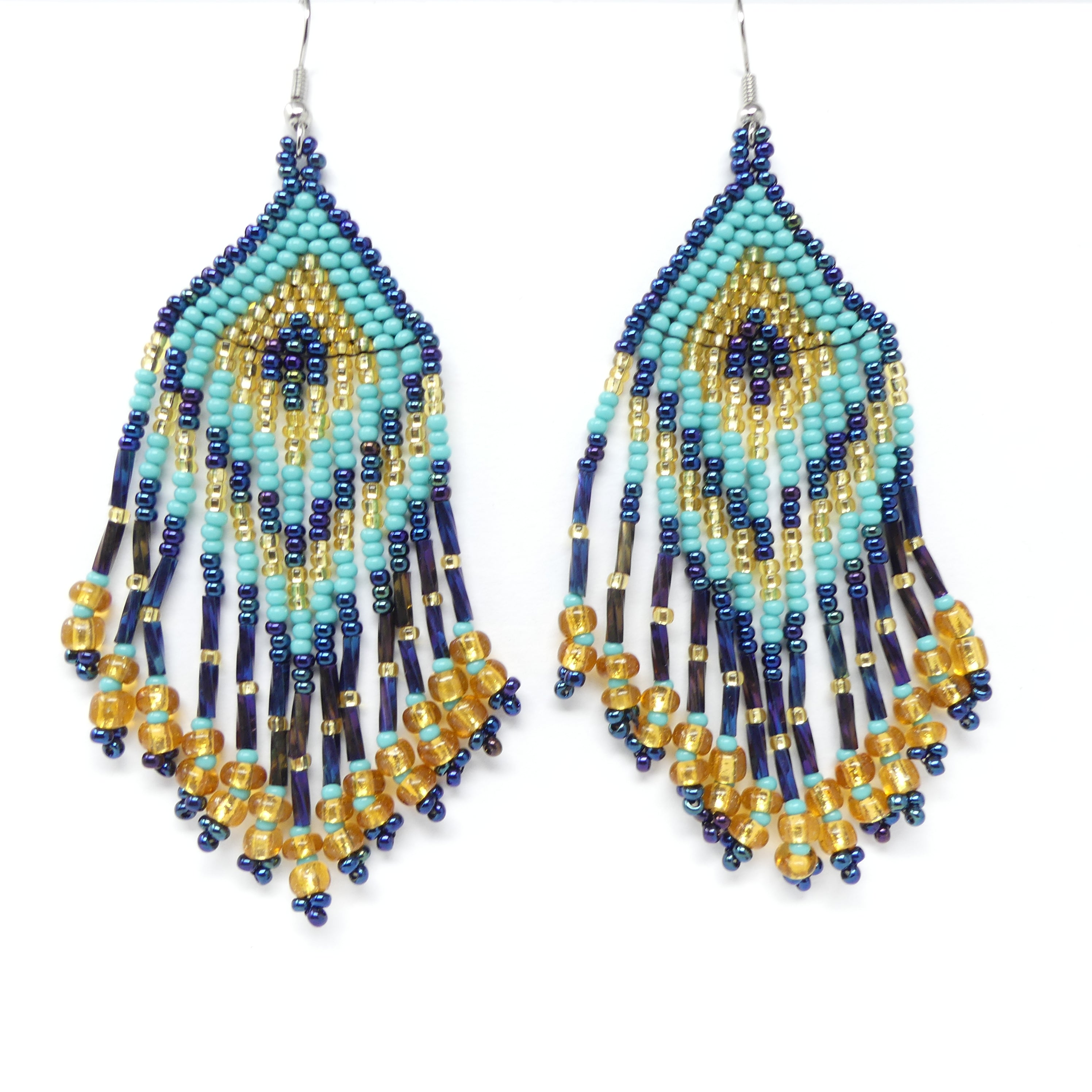 - Large Triangle Fringe earrings made of turquoise, blue iris and gold Czech glass seed beads and bugle beads (the long thin ones in the fringes)