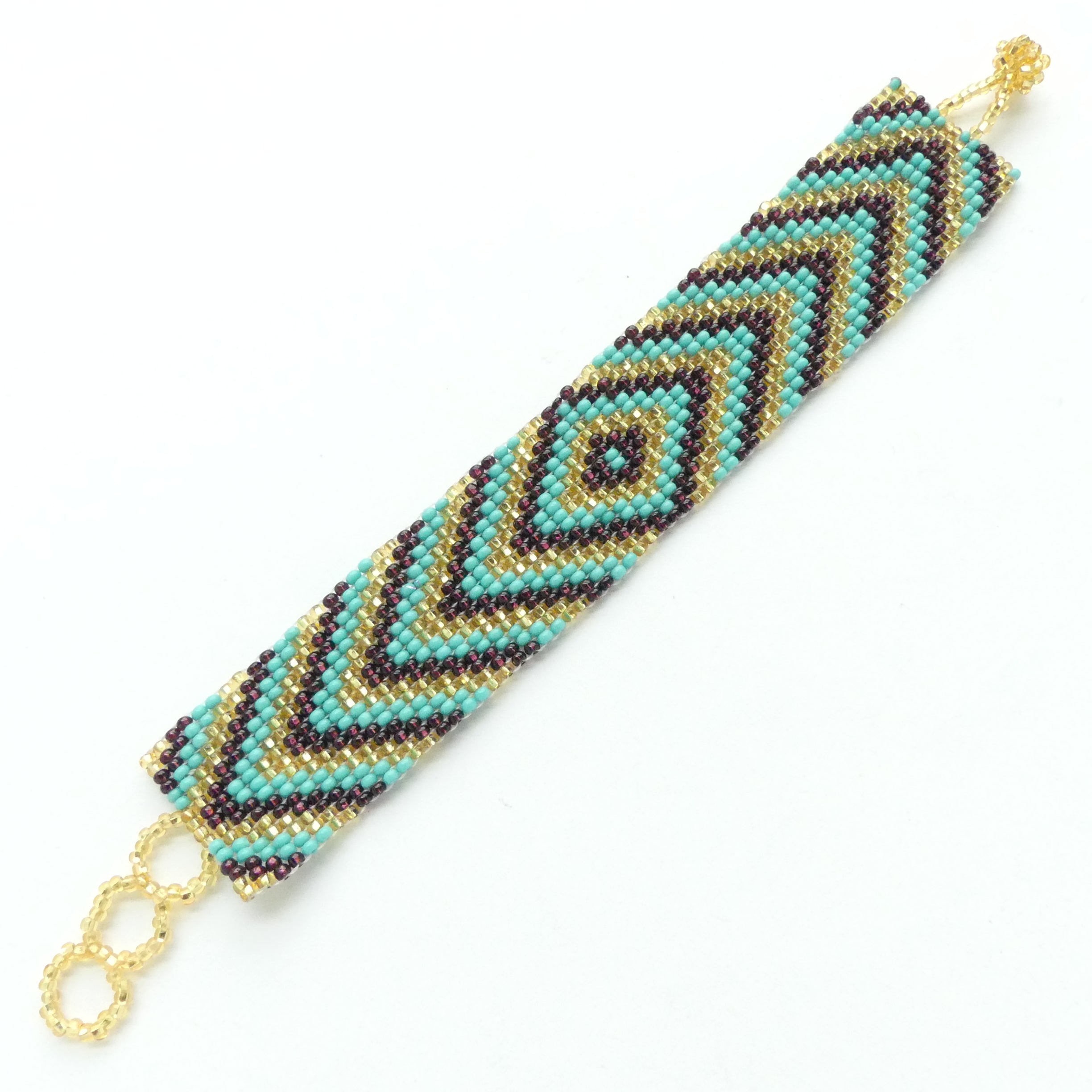 - Traditional bead-woven bracelet, medium, turquoise, gold & amethyst seed beads.