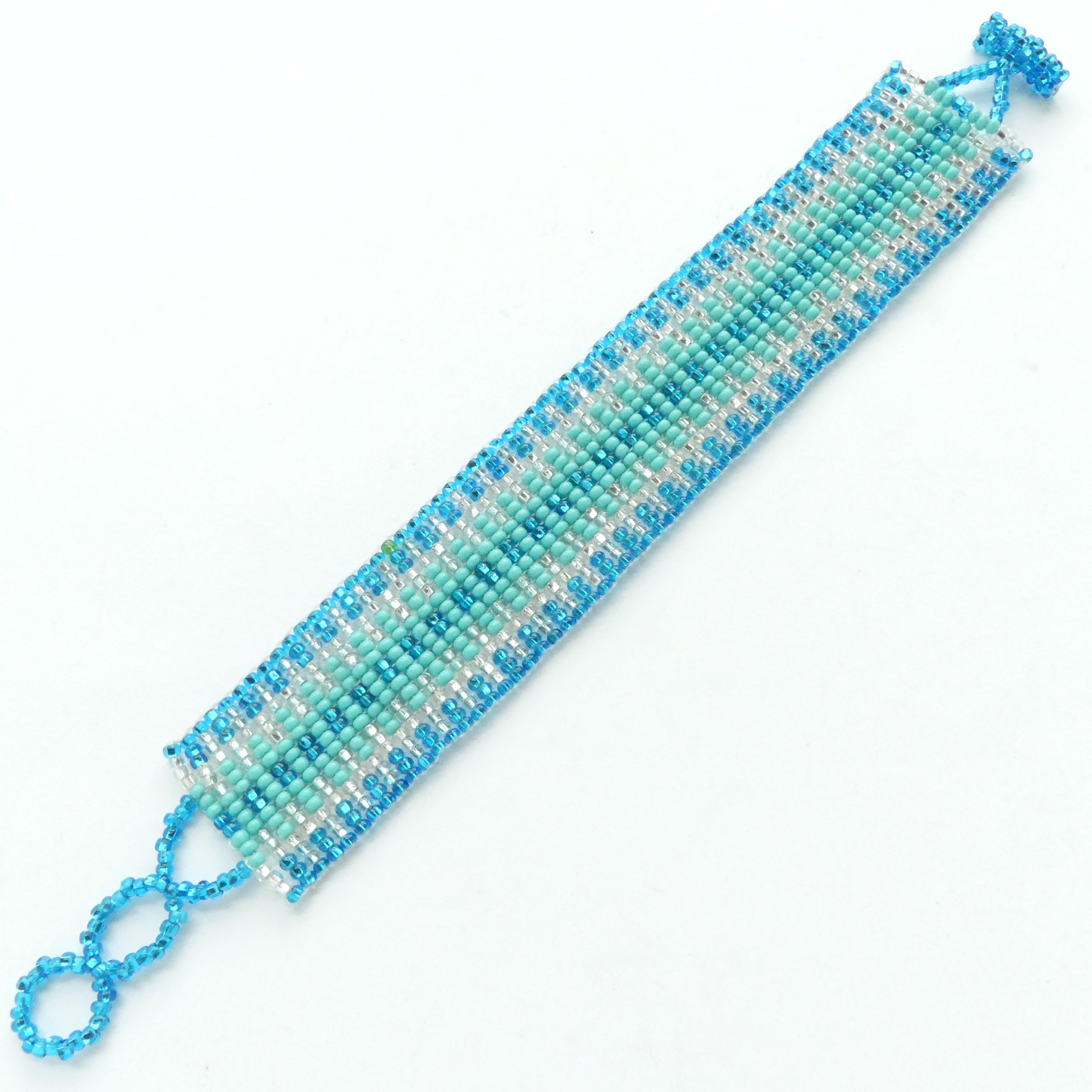 - Traditional bead-woven bracelet, medium, turquoise, aqua & silver seed beads.