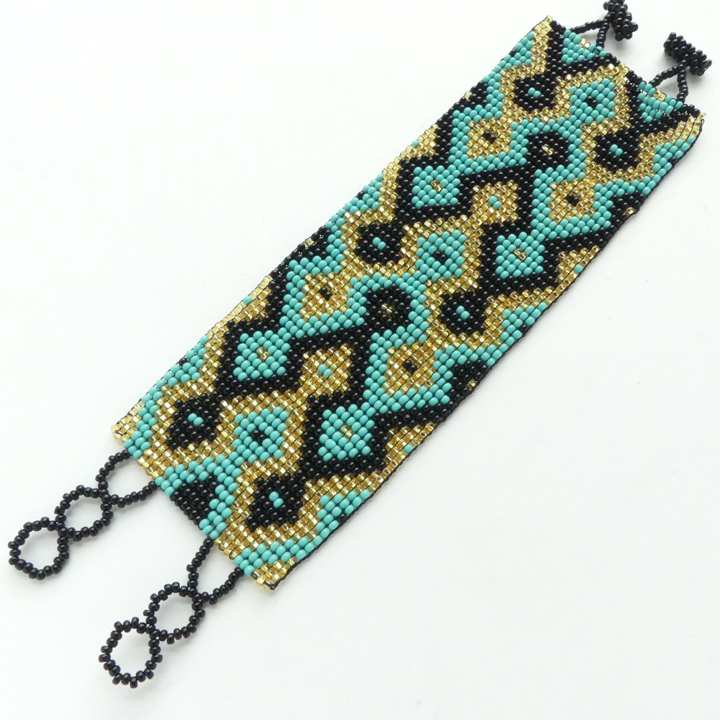 - Diamondback pattern in gold, turquoise and black seed beads