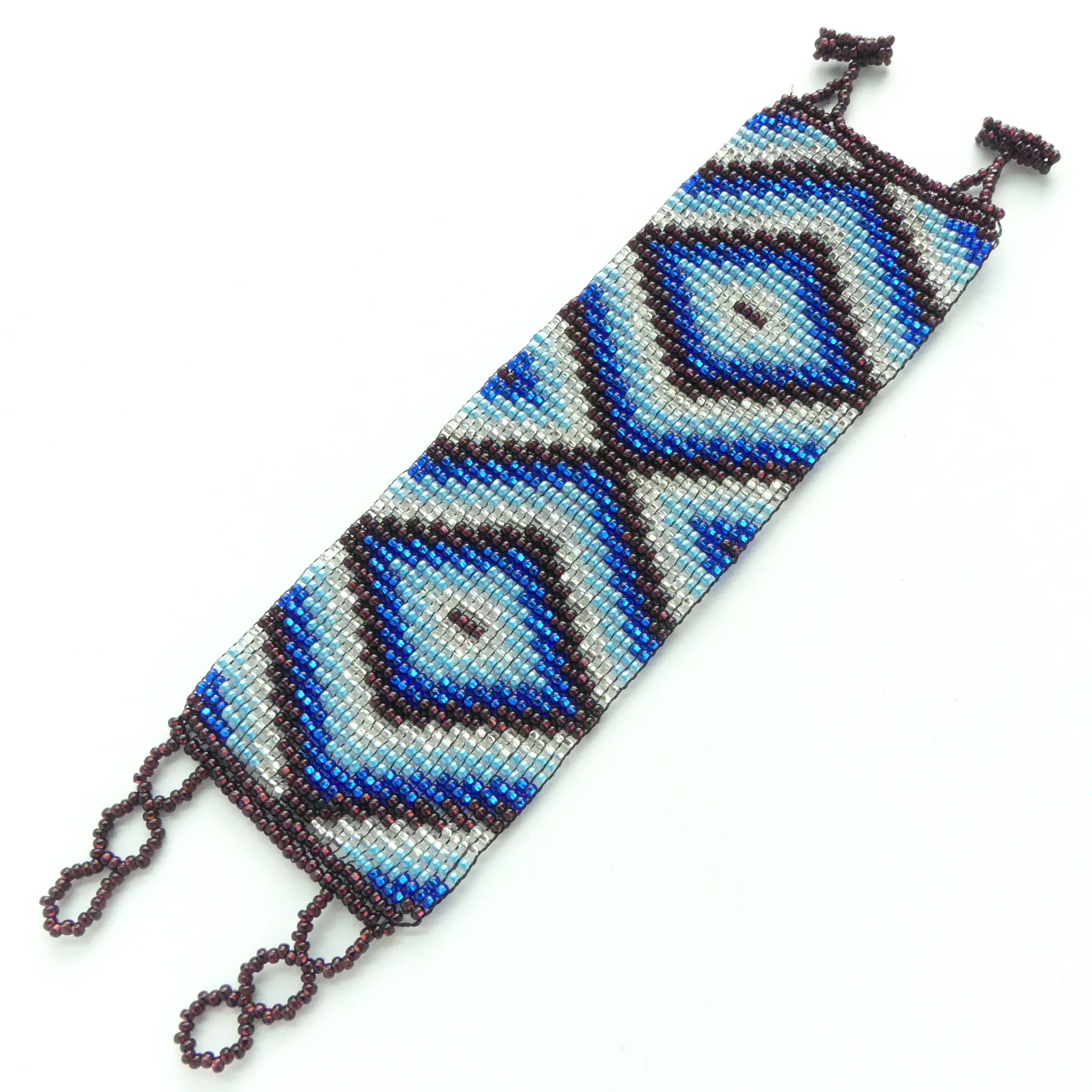 - Diamond pattern in two blues, amethyst & silver seed beads