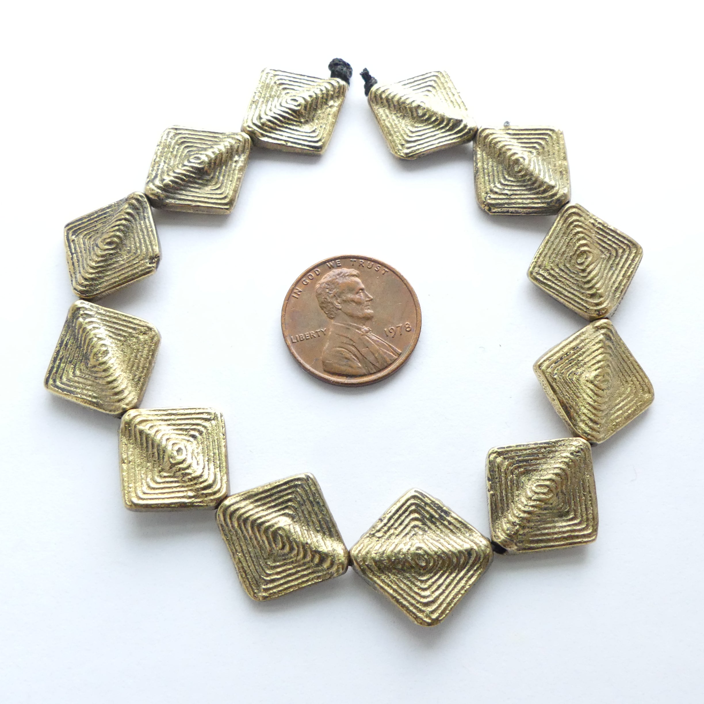 - Strands of 12 textured brass diamond-shape beads, 13x13mm