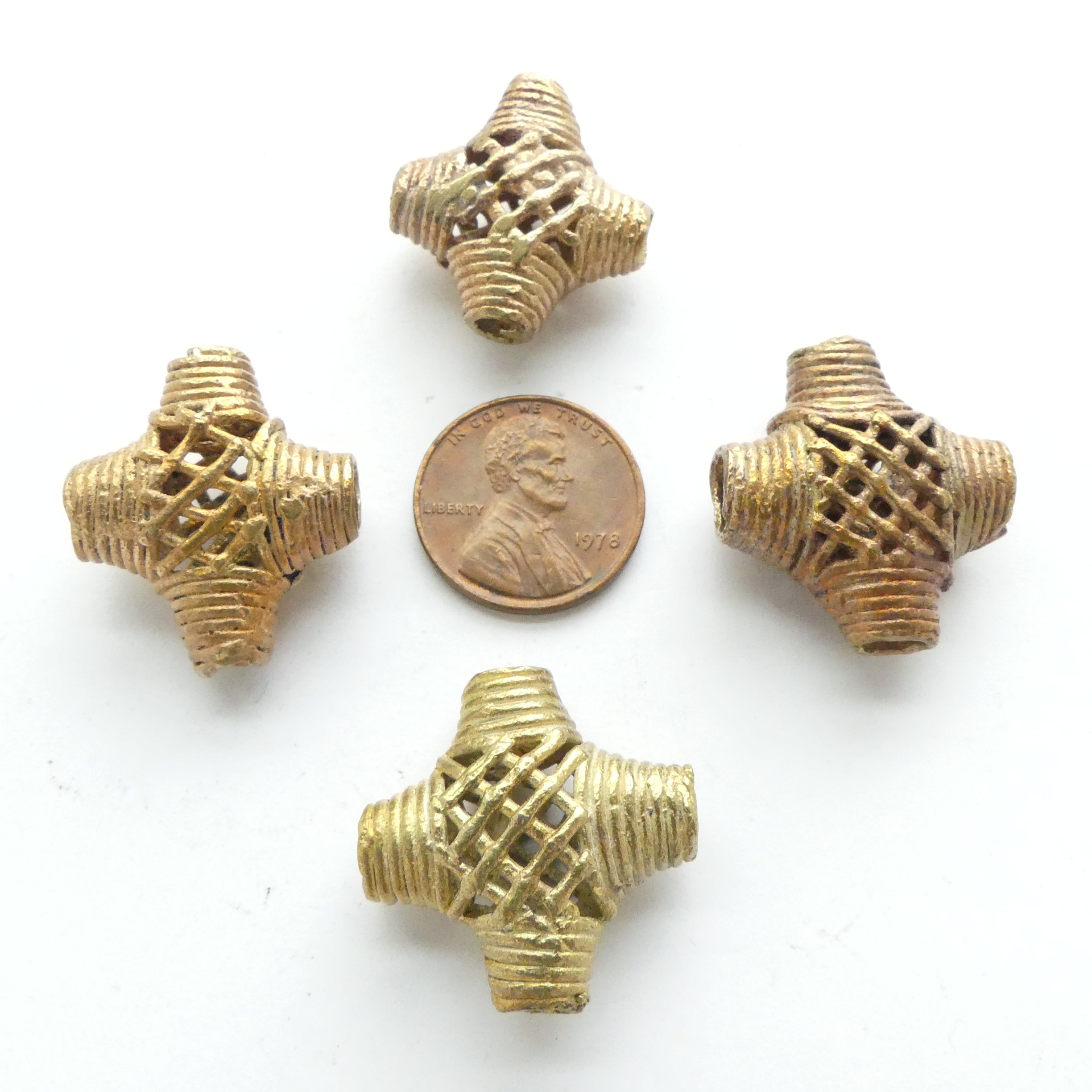 - Lost Wax Cast brass beads from Ghana cross shaped with crosshatched design in the center. Can be strung in either, or both, directions. Extra large holes.