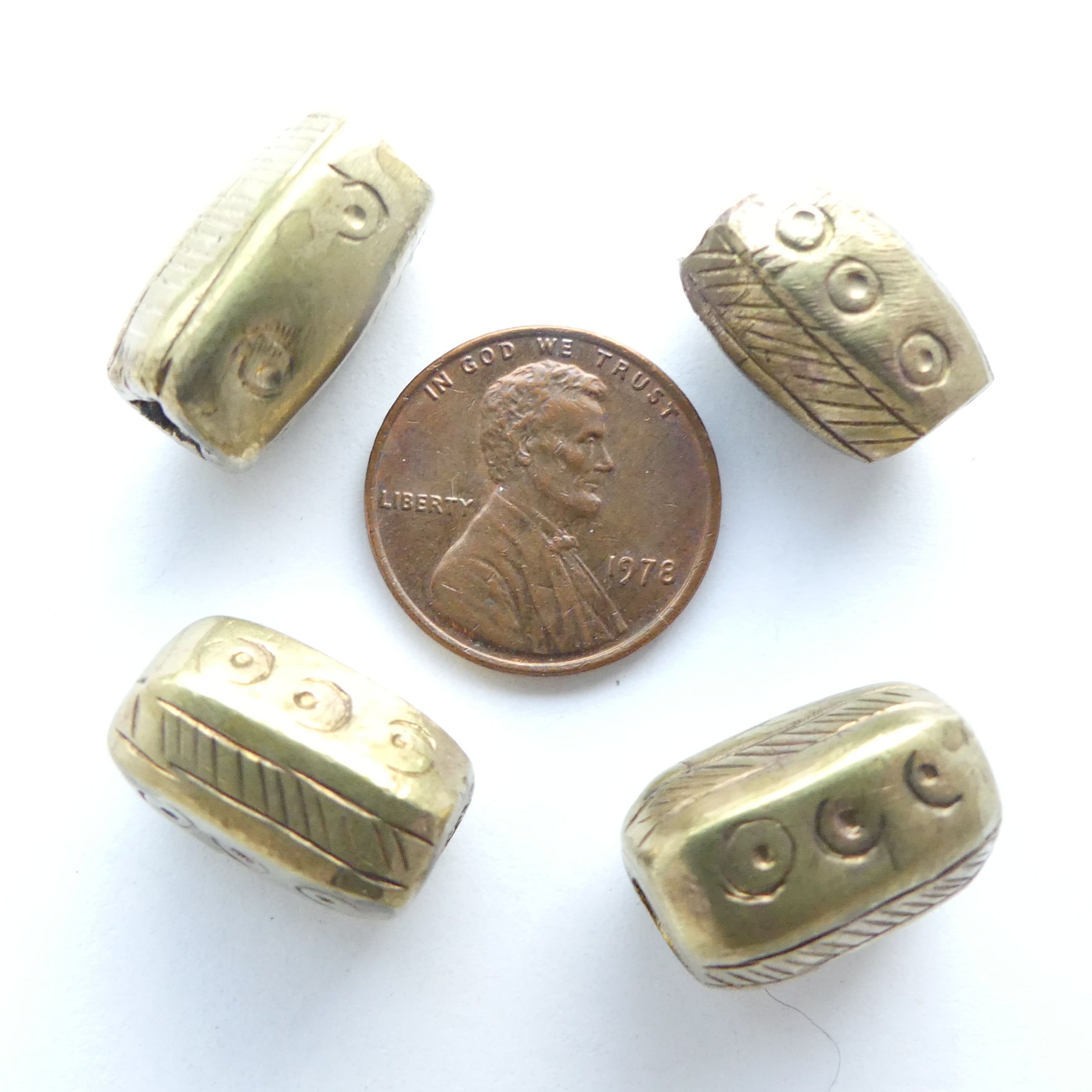 - Set of 4 antique Nigerian brass beads, most 15-17mm long and 10-12mm wide