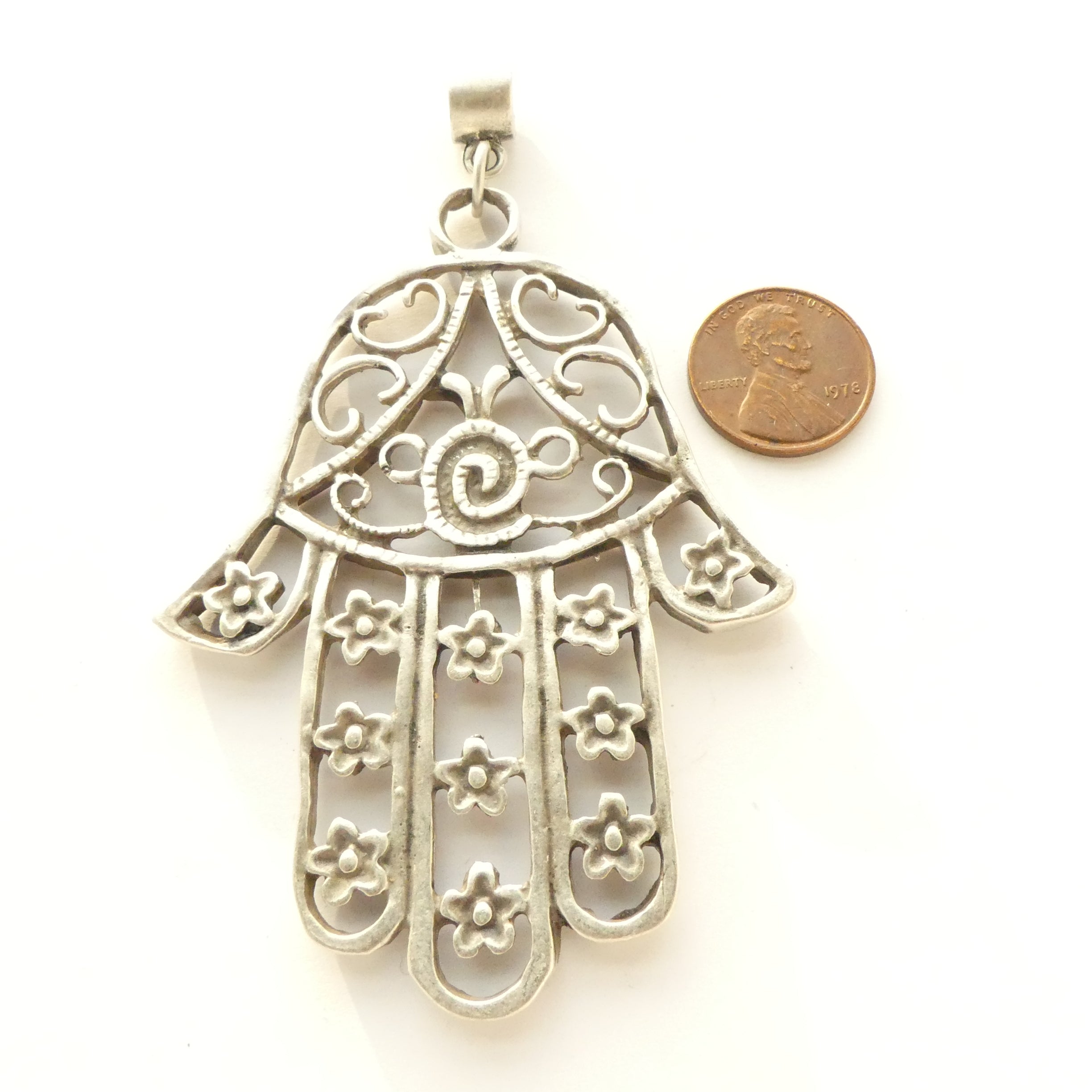 • Extra large white metal openwork Hamsa amulet, 4 inches long including bail