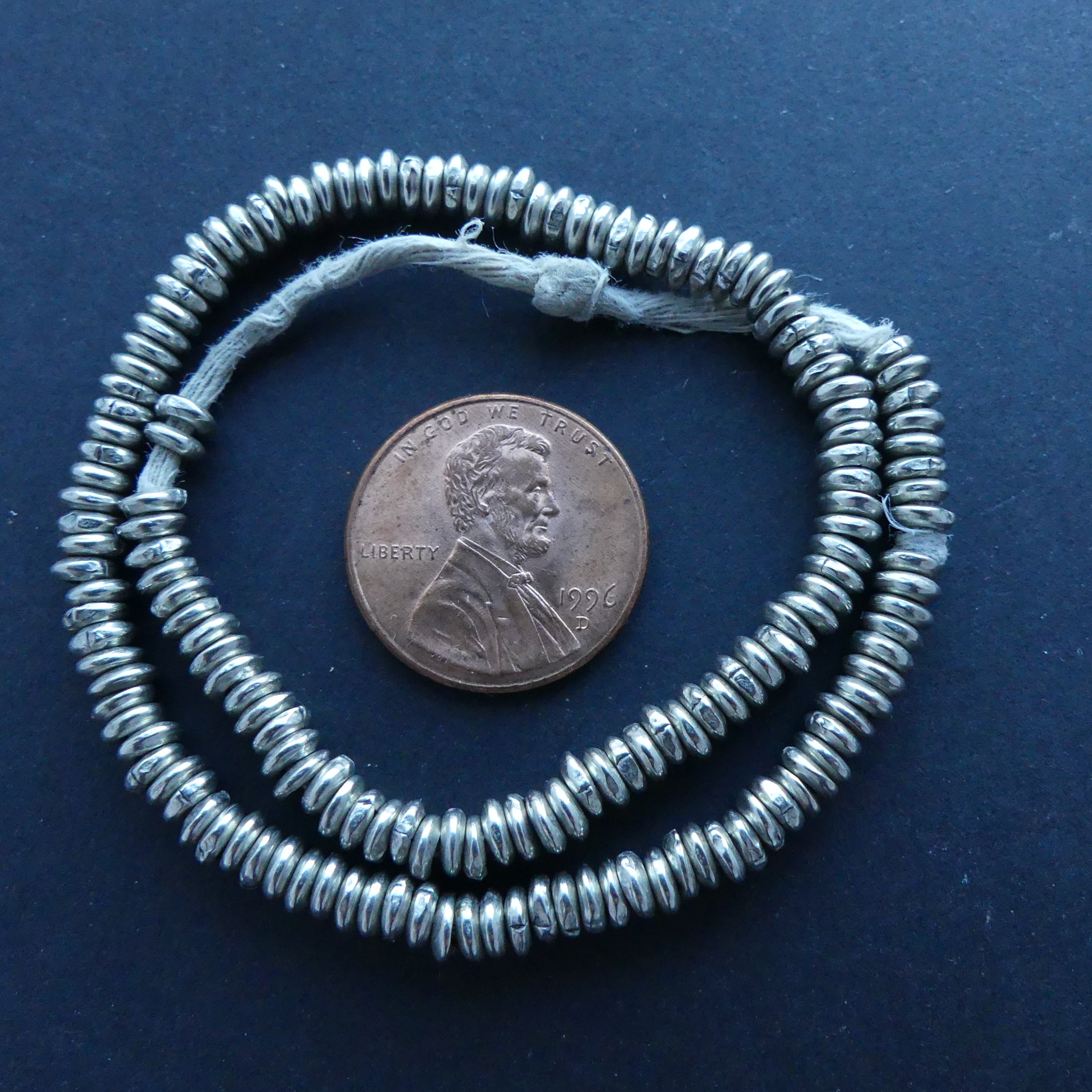- Strands of white metal heishi beads from Kenya, 4mm size on short 9"strands
