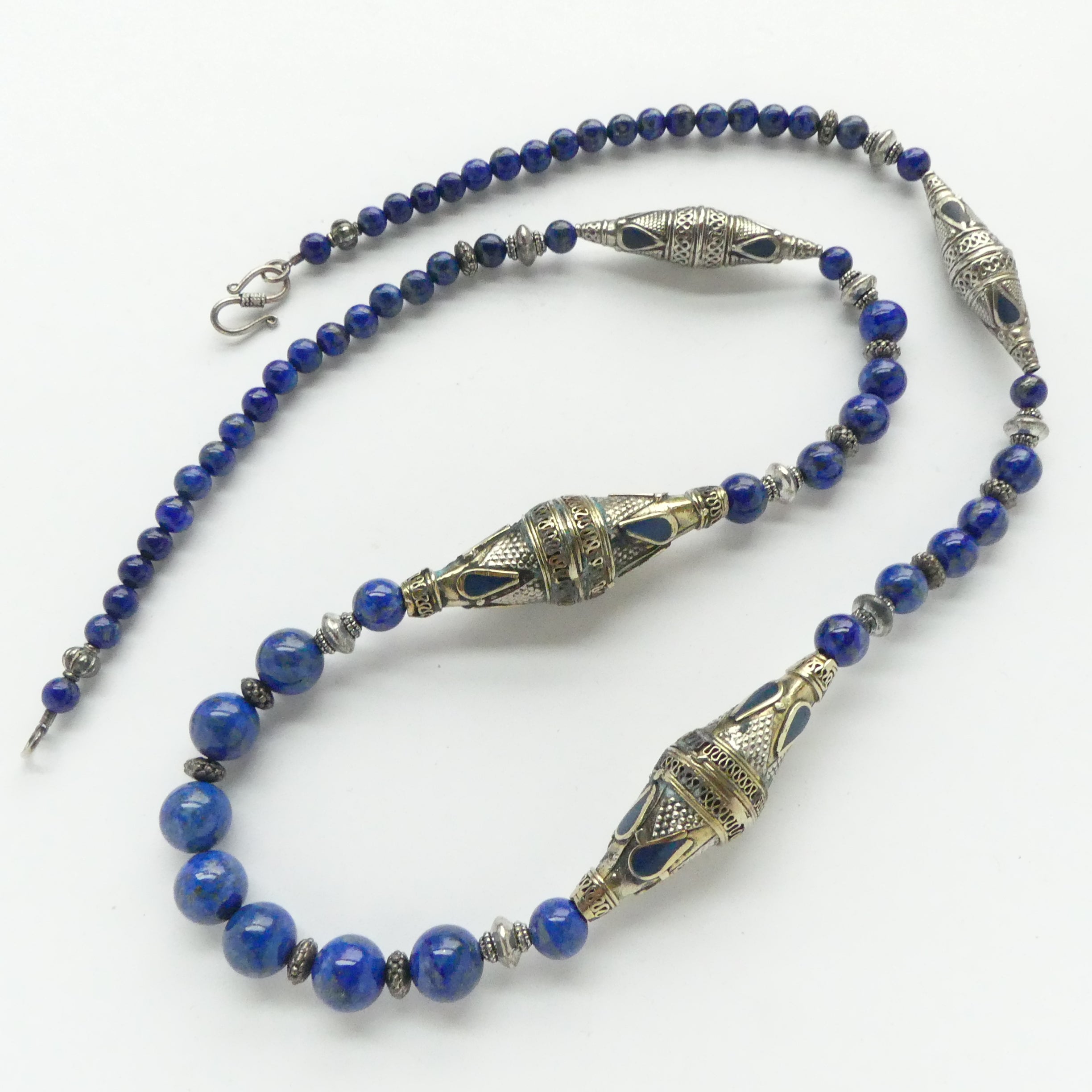 - Necklace of Afghan silver bicone beads with lapis inlay and graduate round Afghan lapis beads, 10 to 5mm diameter. Necklace is 27 inches with sterling silver clasp and vintage Indian silver spacers