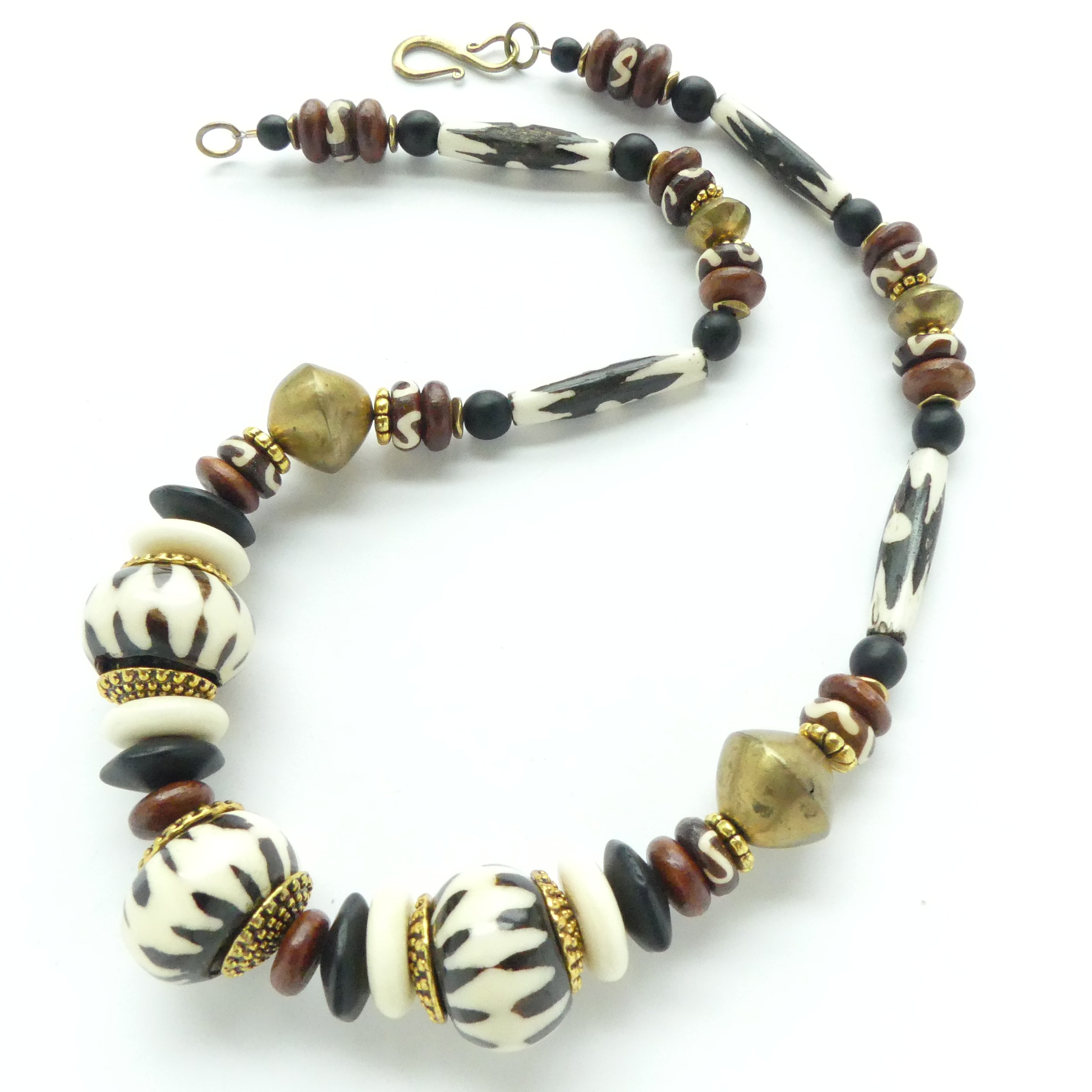 - Batik Bone oblates and elongated beads from Kenya, Mali brass bicones and various bone, wood, glass and brass spacers. Brass S-hook clasp