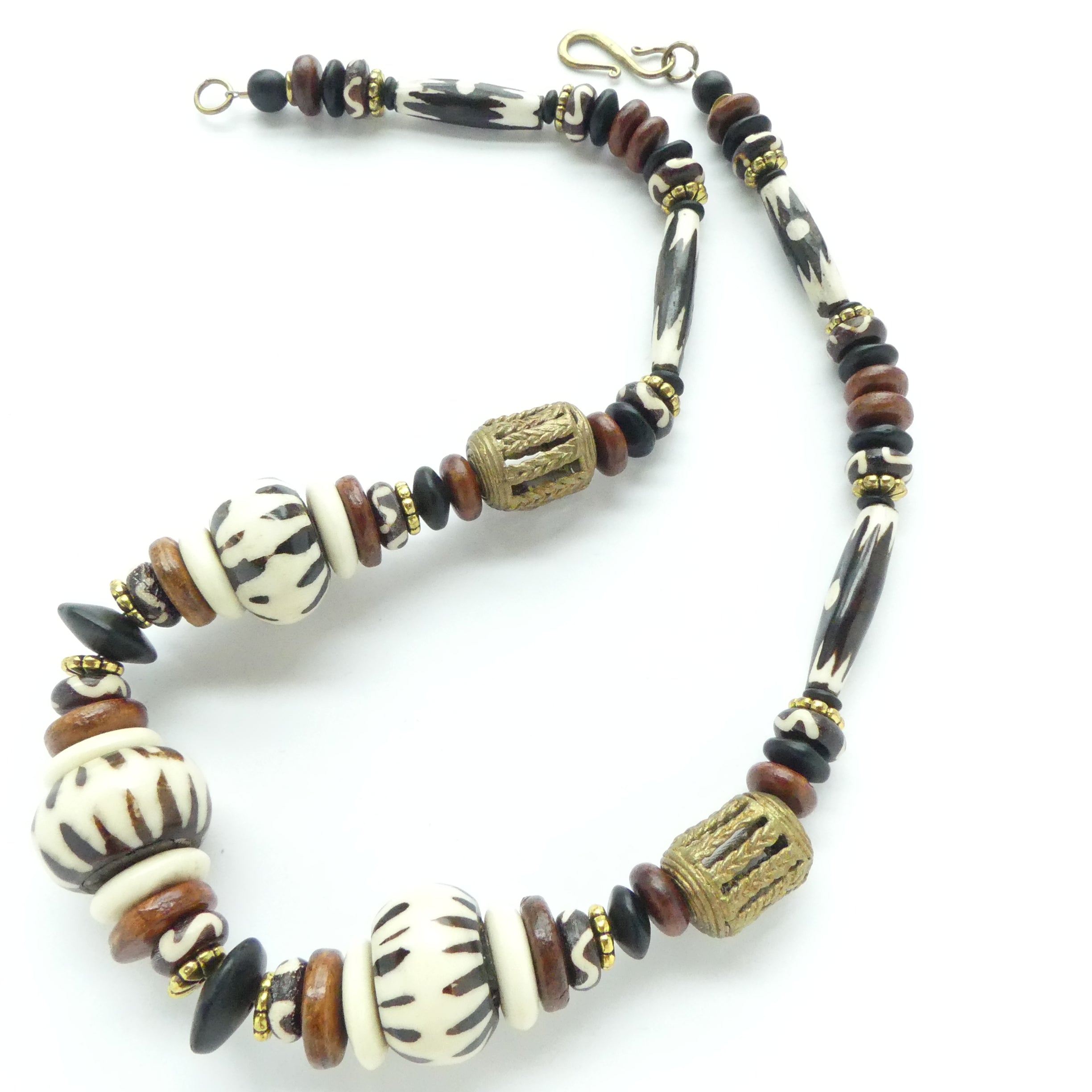 - Batik Bone oblates and long beads with two openwork lost wax cast beads from Ghana, bone, wood, glass and brass spacers and brass S-hook clasp