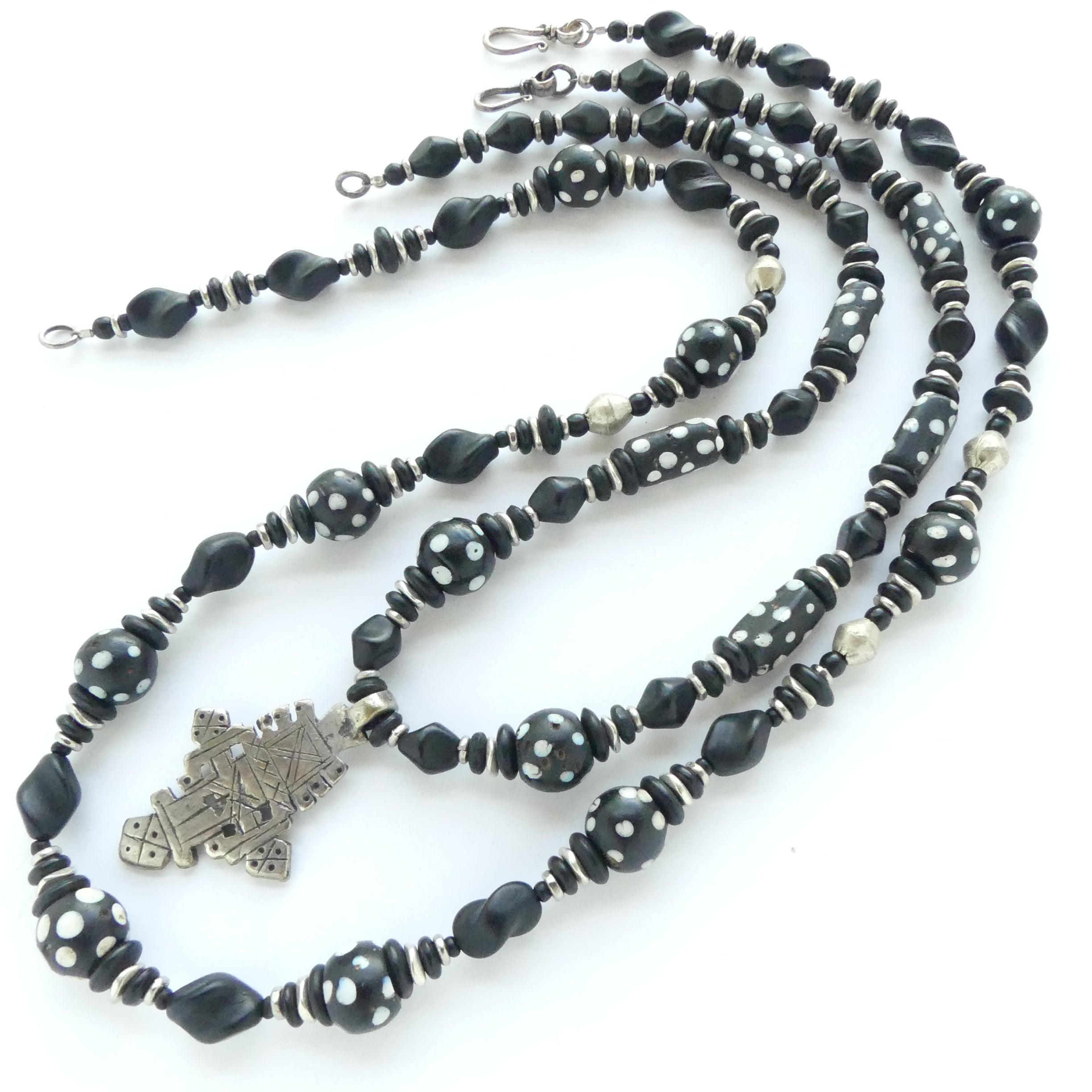 Black & White Antique Venetian Trade Beads with Small Ethiopian Cross, 19 inches long