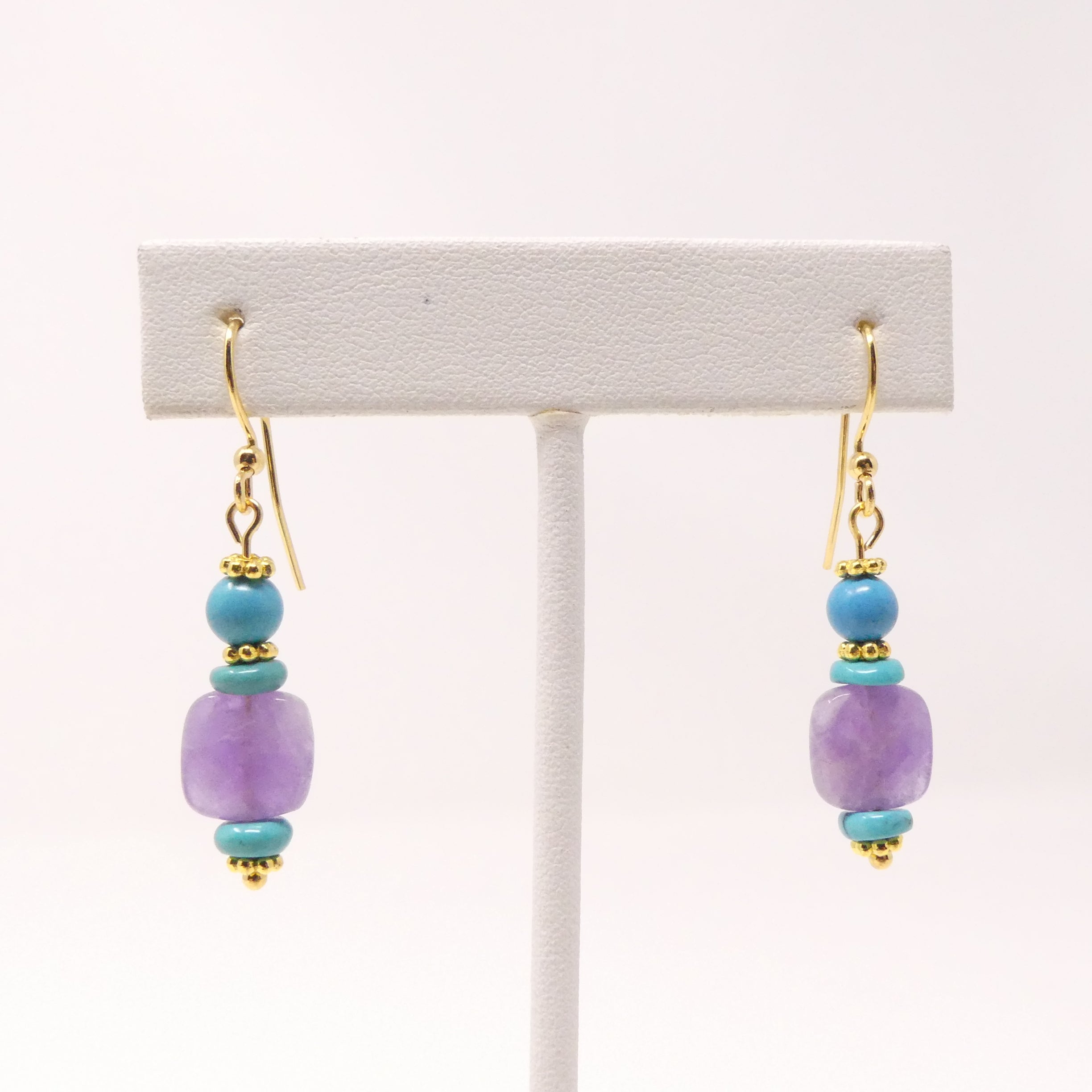 - Cape Amethyst faceted square beads, framed by turquoise slices and topped with a 6mm turquoise bead. Gold plated daisy spacers and wires. 1" long