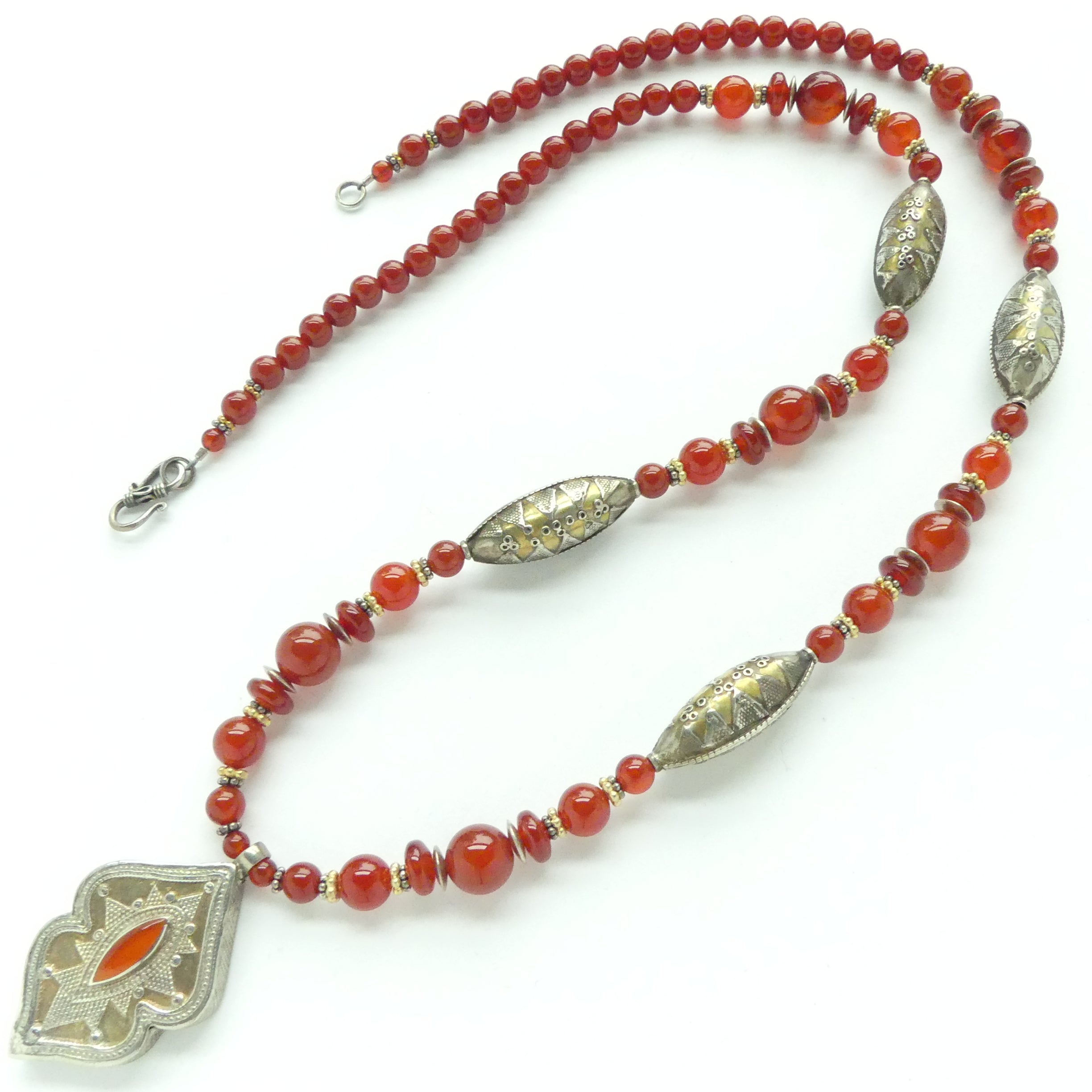 Carnelian Long Necklace with Vintage Turkoman Pendant and Beads, 30 inches long
