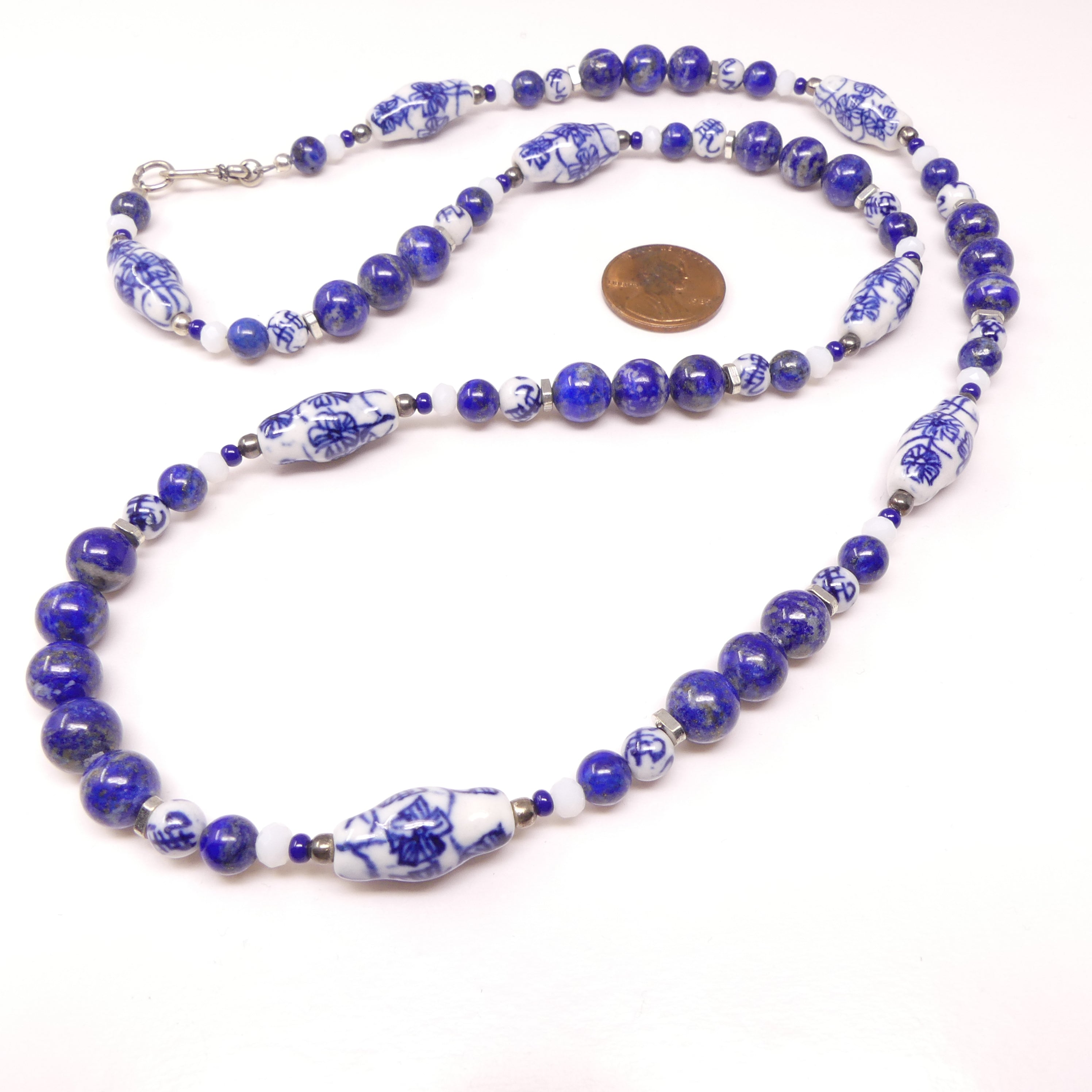 Classic Blue and White Porcelain Beads Paired with Lapis Lazuli and Silver, 26 inches