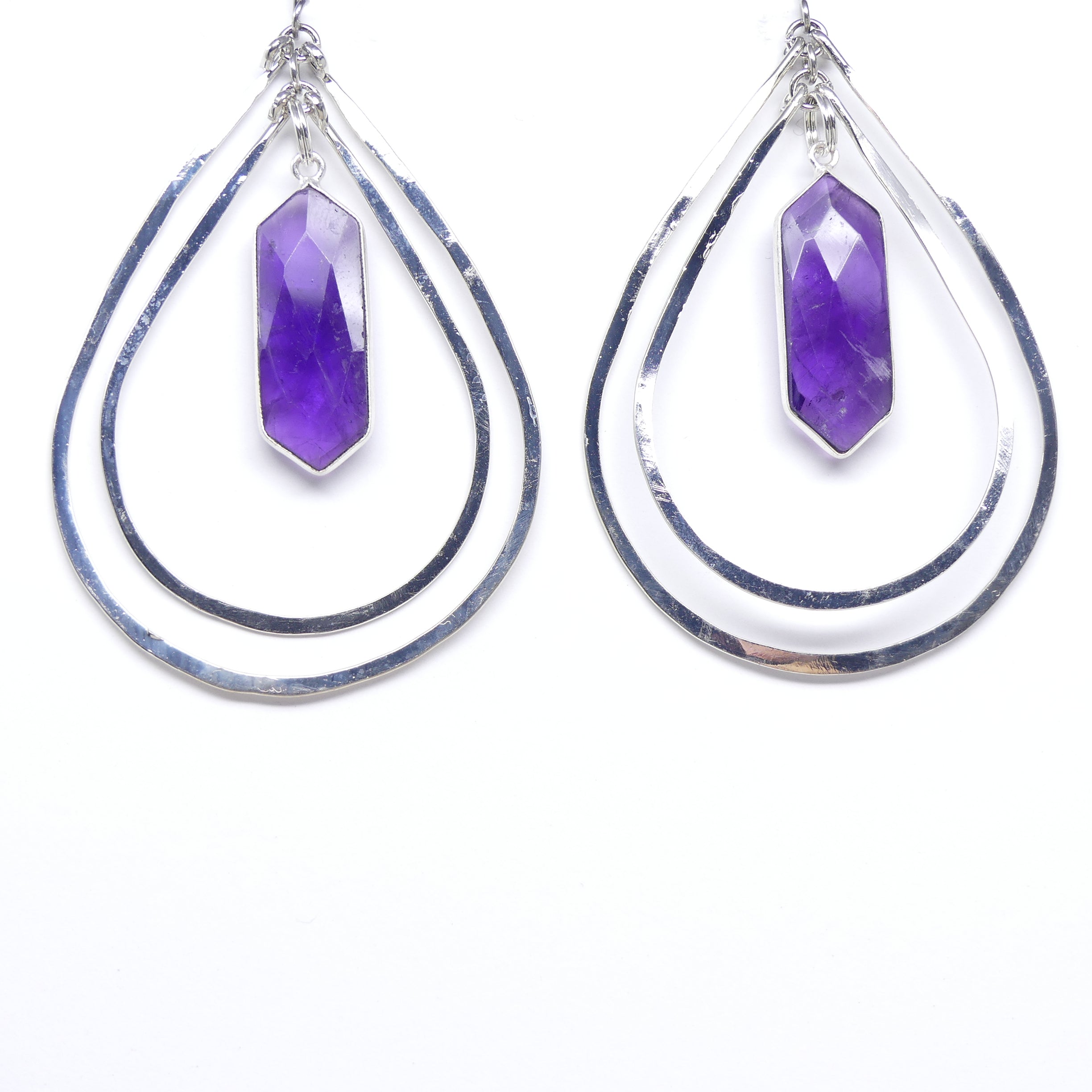- Faceted amethyst long hexagons caged in sterling silver, swinging free in a pair of large hammered double silver alloy loops from Peru