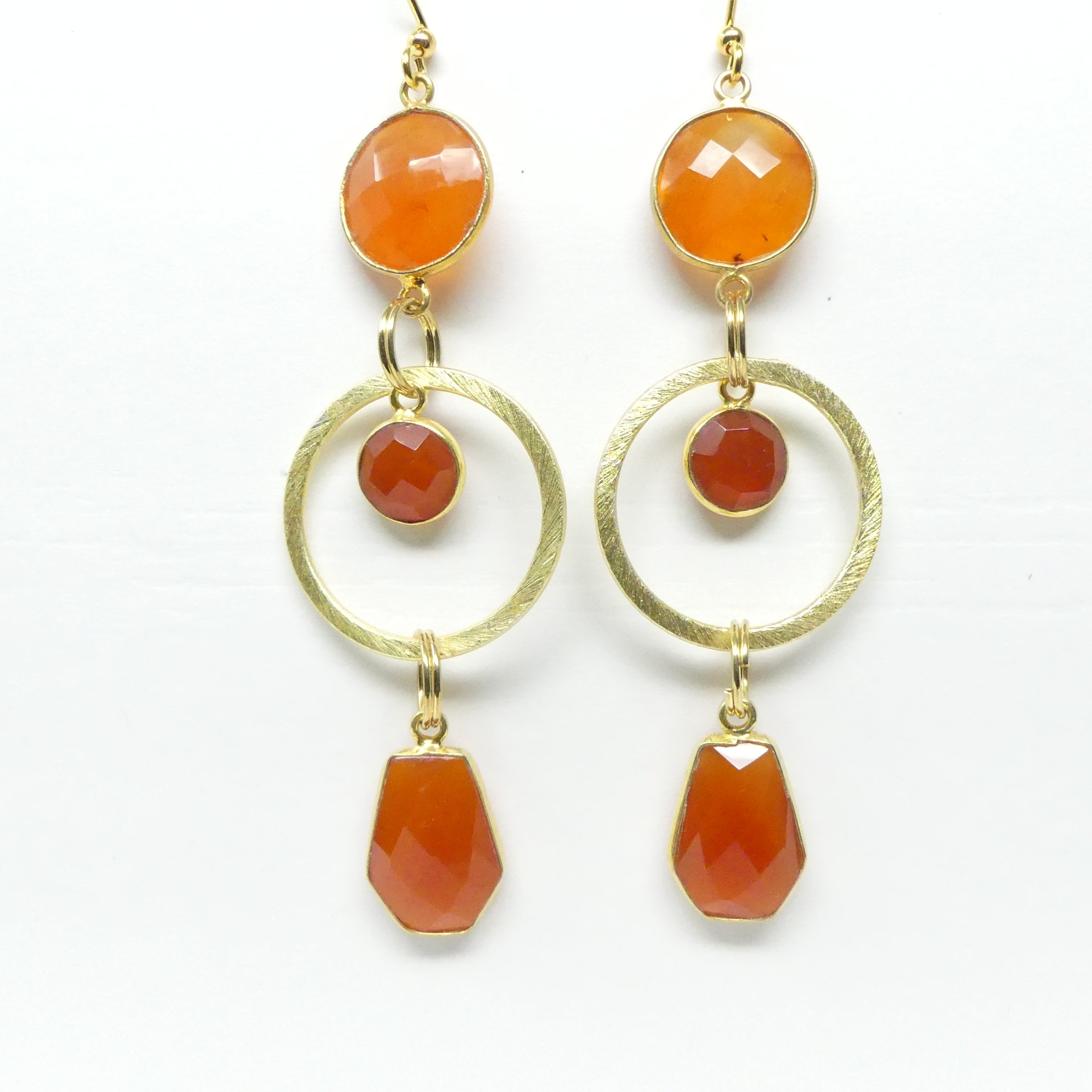 Earrings Gold Plated Rings with Three Pairs of Framed Carnelians, 3 inches long