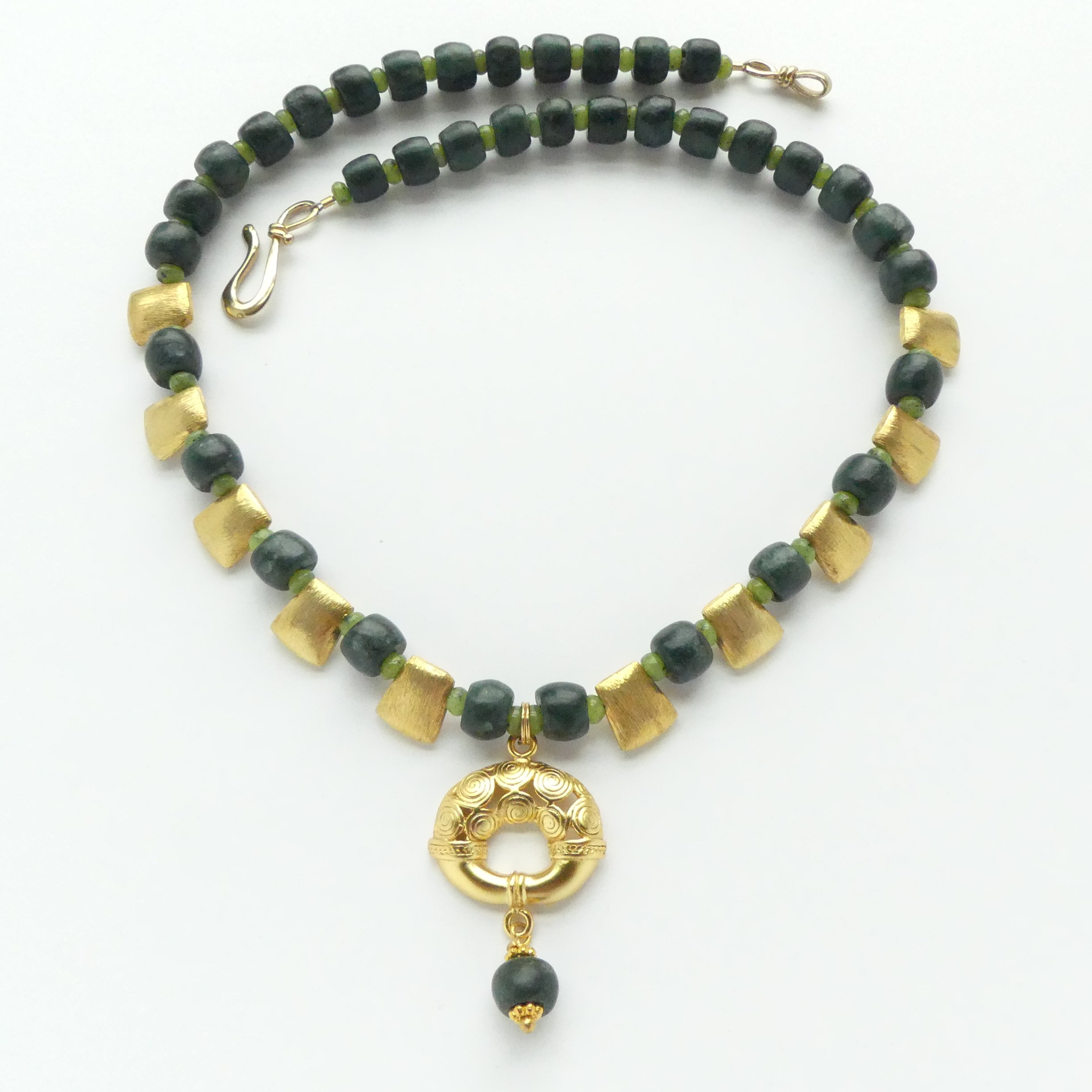 - Guatemalan serpentine, one of the greenstone "cultural jades" revered by the ancient Maya, combined here with gold plated axe blade pendants and museum quality reproduction of ancient Columbian gold pendant (1" wide) 18 inches long