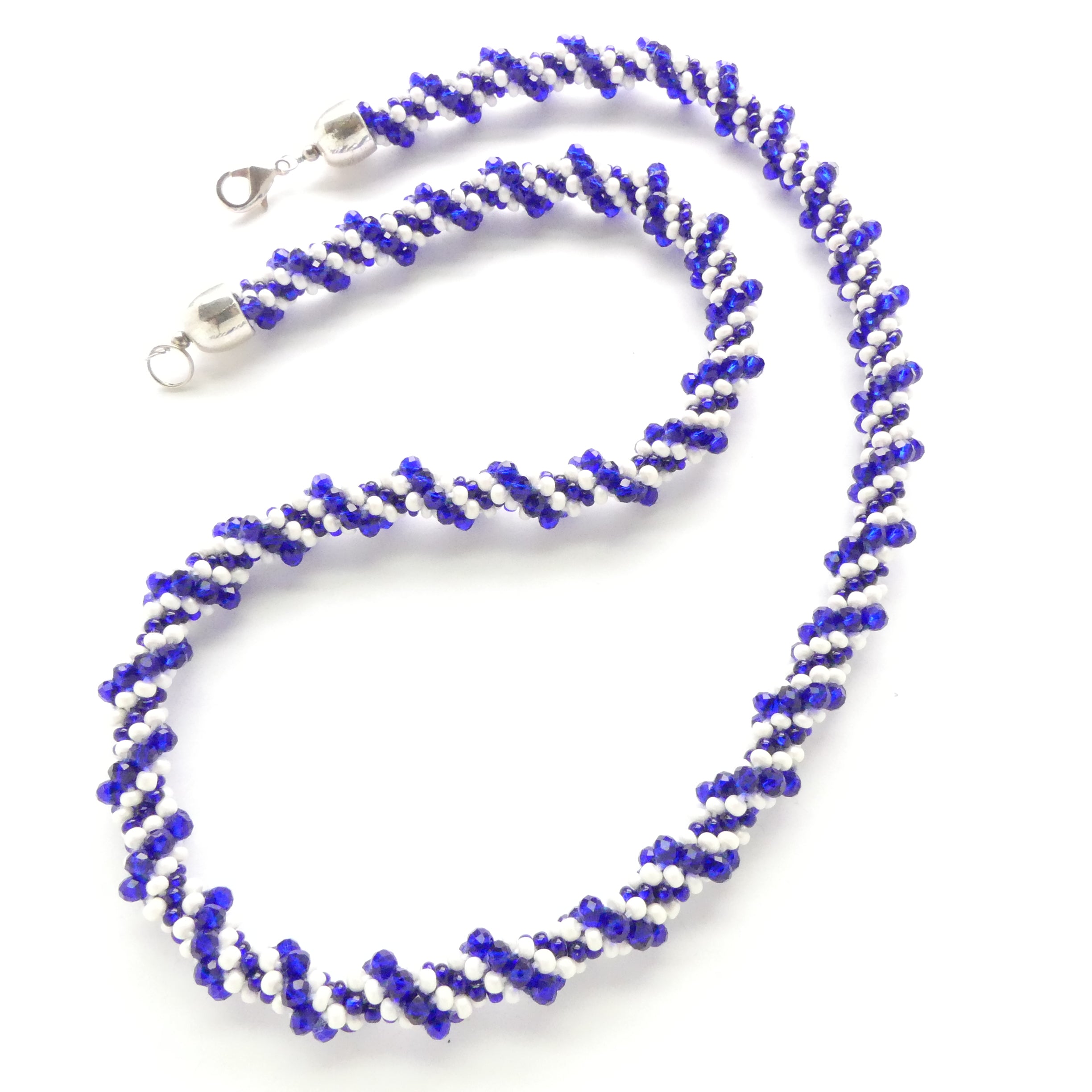 - Kumihmo necklace in a spiraling pattern of cobalt blue 3mm crystals, pearly white size 8 seed beads, and smaller cobalt blue seed beads. 25 inches long