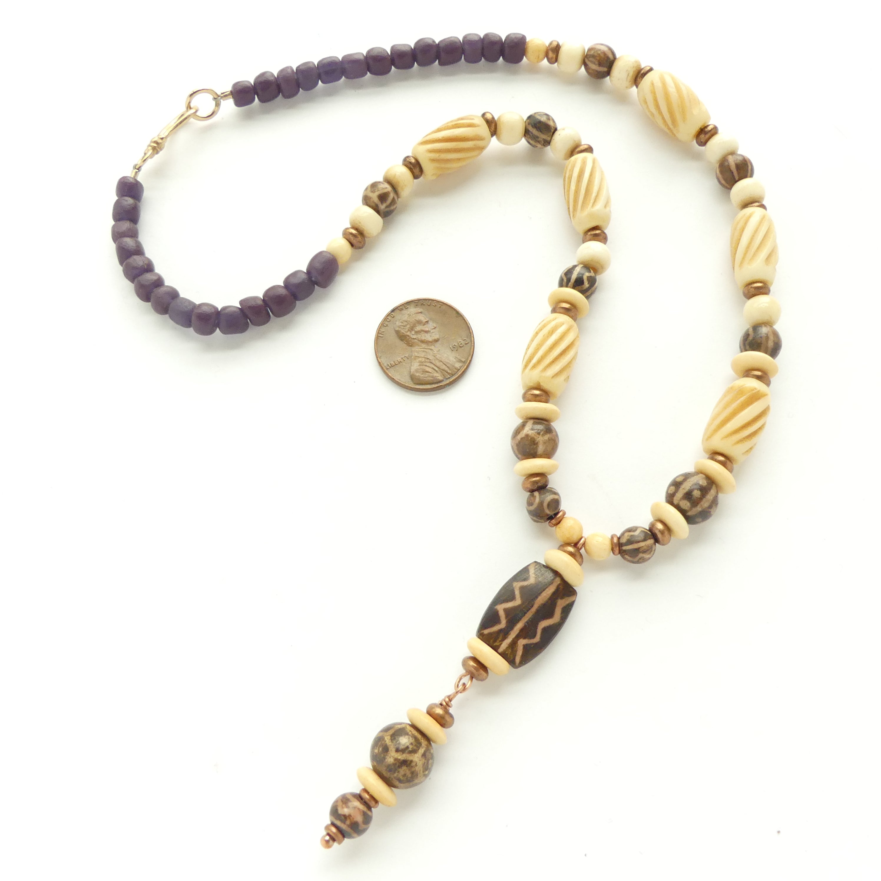 - Necklace of Indian bone beads, vintage and ancient Pumtek beads, copper and dark chocolate colored Indonesian glass beads.