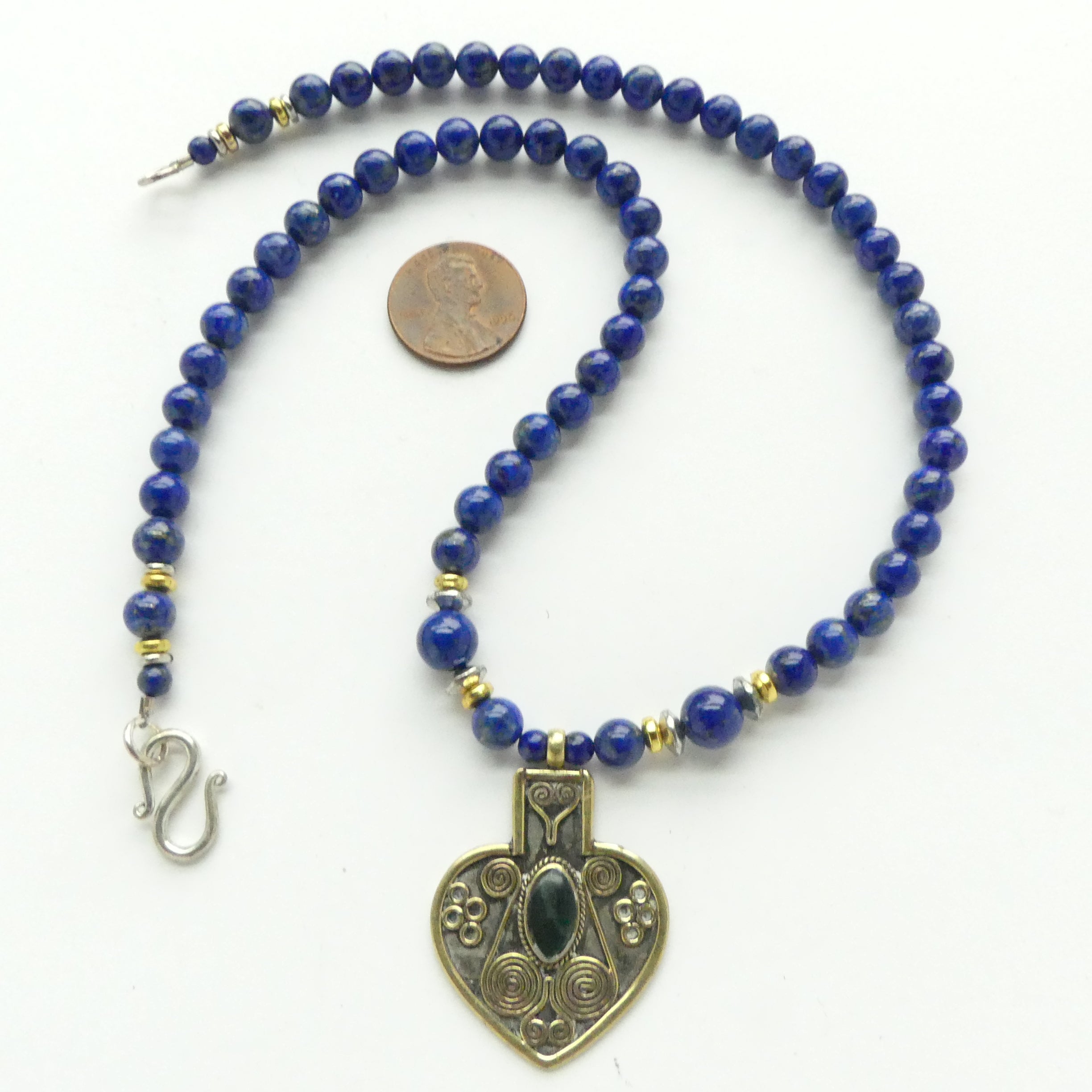 Turkoman Heart Shape Pendant, Small with Lapis Cabochon & Lapis Beads, 17.5 inches long
