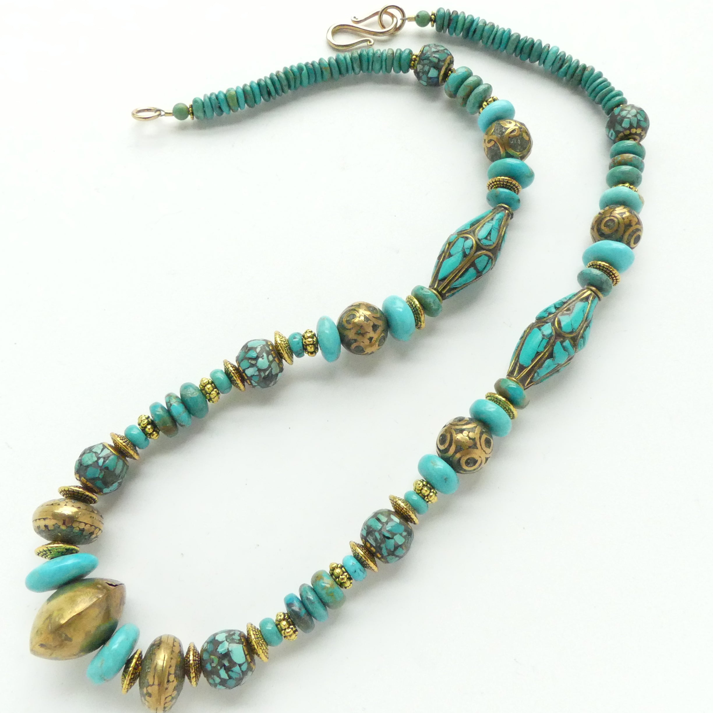 - Turquoise Rondelles flank large (18mm) central brass bead and vintage Tibetan and Nepales turquoise chip beads with brass. Brass spacer and clasp with 6mm turquoise heishi finish it off at 22 inches