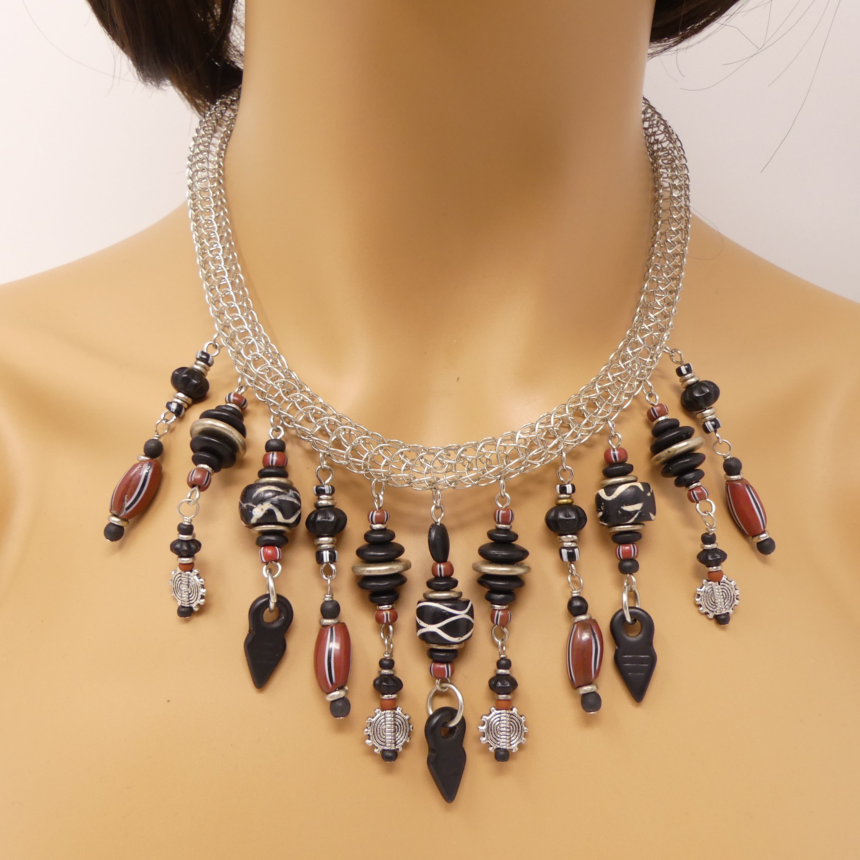 - A Viking knit treasure necklace of collectible African Trade beads in black, white and rich brick color with silver tone accent beads and wire. Czech glass matte black spacers and mini "tanfouk" points complete the design.