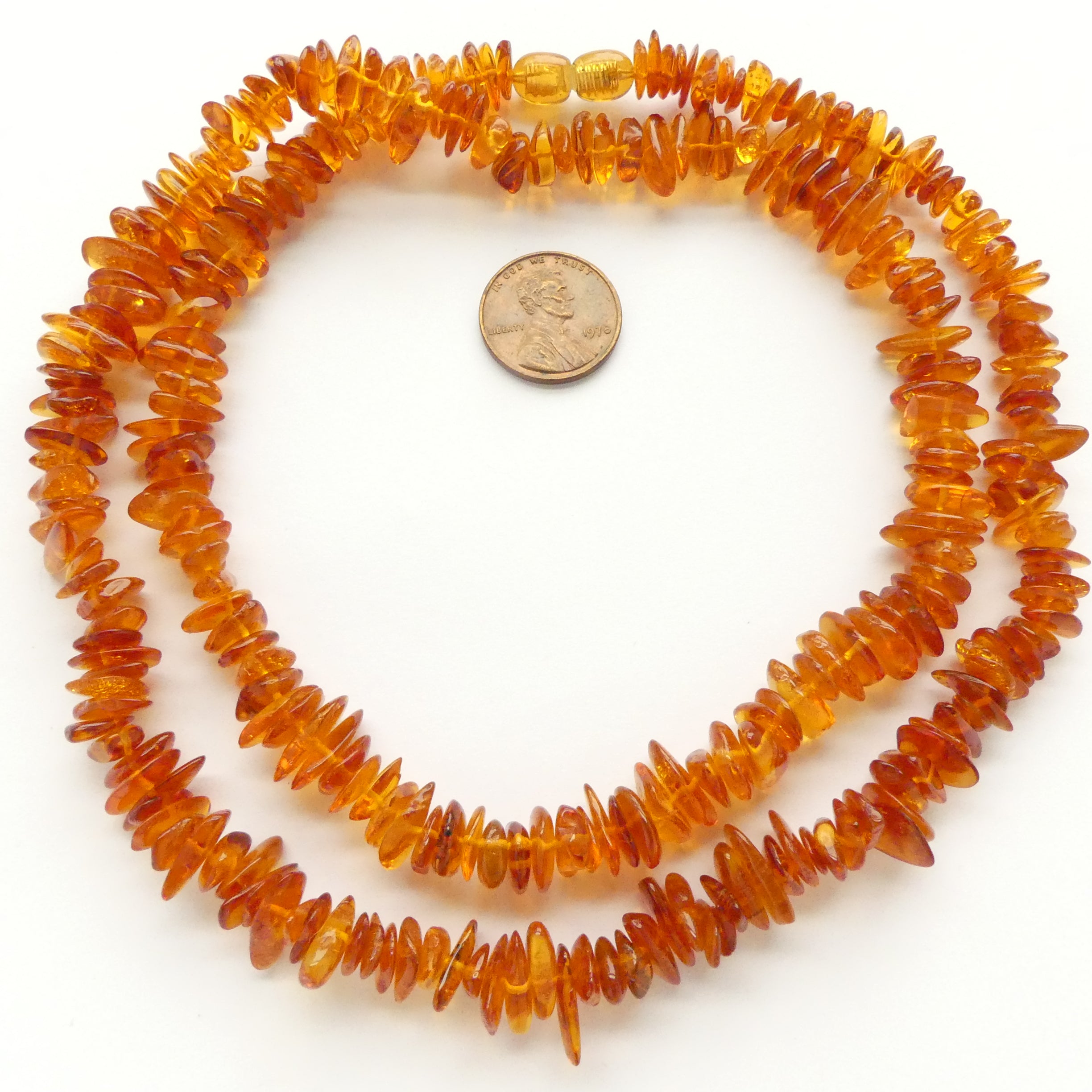 • Amber chips 6-8mm diameter on long 27" strand with amber covered screw clasp