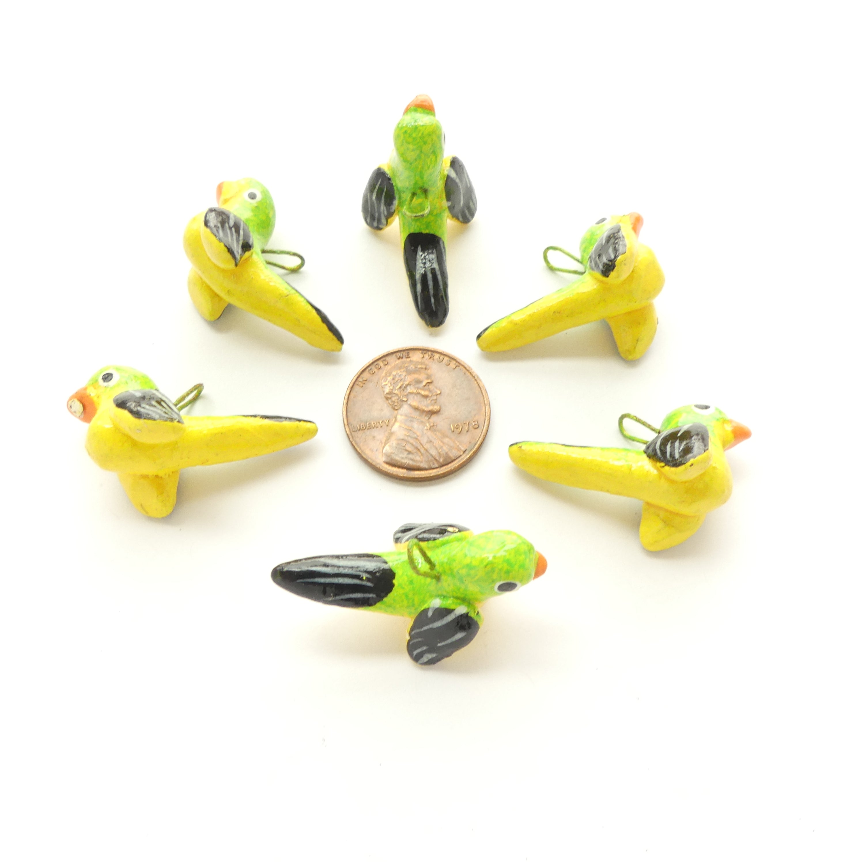 Clay Birds, Mini, Guatemalan, Yellow with Green & Black, 25mm, Sets of 6