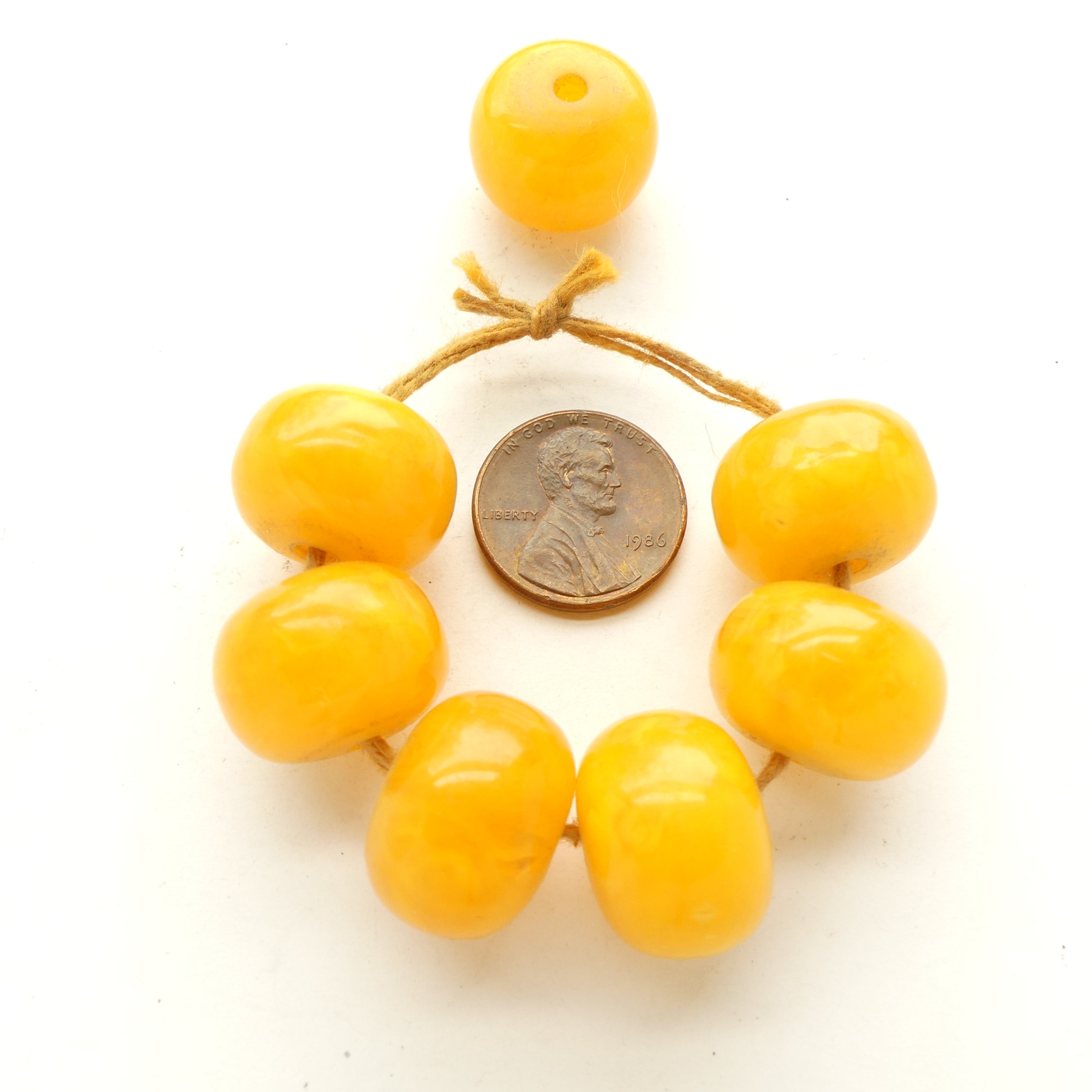 - These bright, shiny yellow orange oblate (squashed round) beads are probably or a Asian origin. The resemble to popular matte finish African Faux Amber beads, in shape and size, but they have a shiny finish.